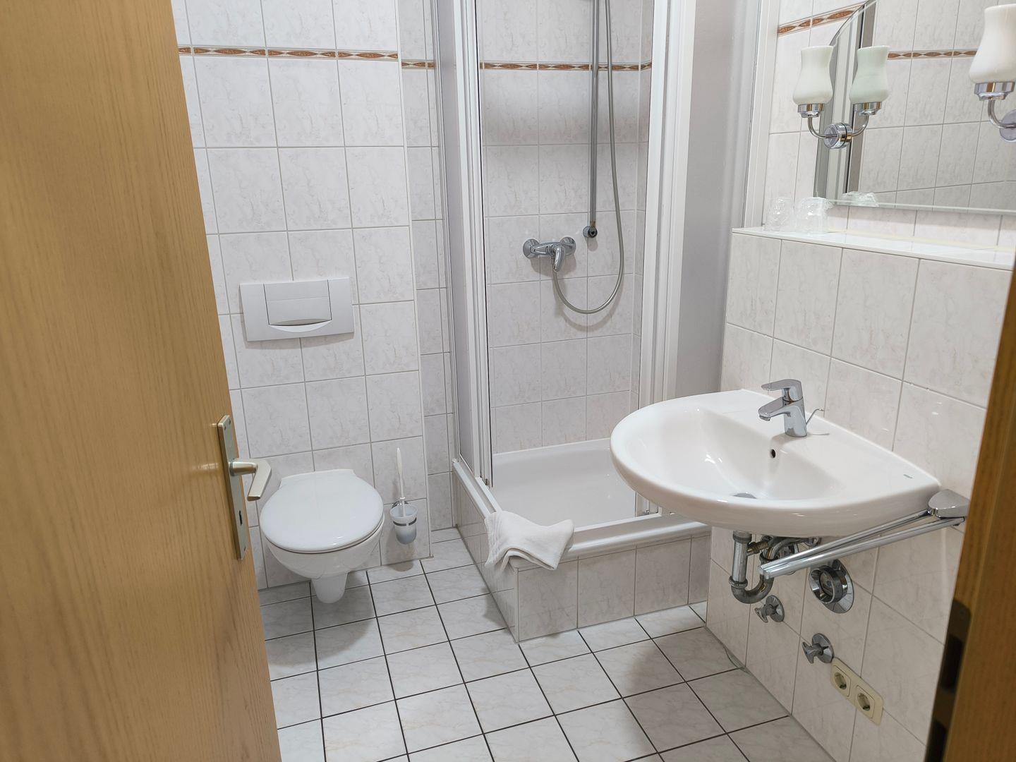 Bad mit Dusche, WC, Föhn und beleuchtetem Kosmetikspiegel