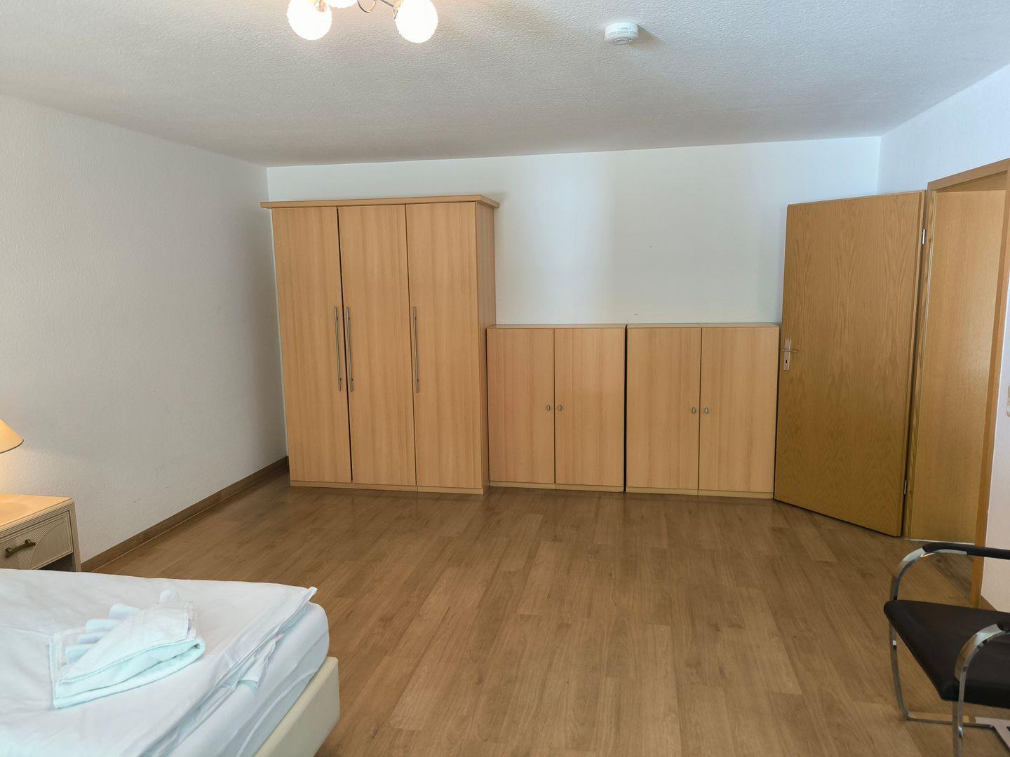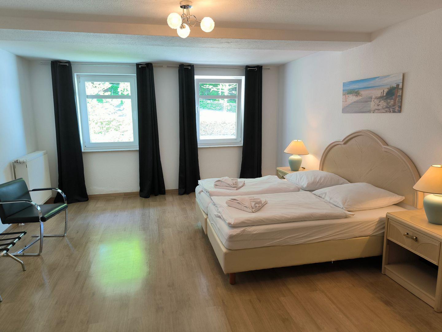Schlafzimmer mit Doppelbett (180 x 200 cm), Nachttischen, großem Kleiderschrank, Kofferablage