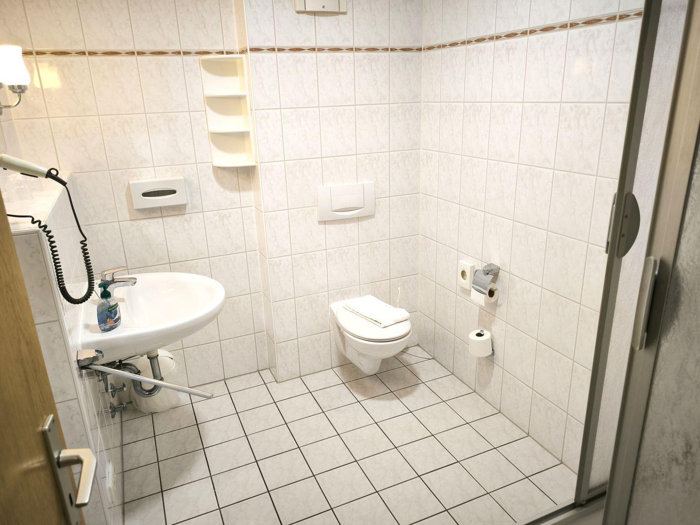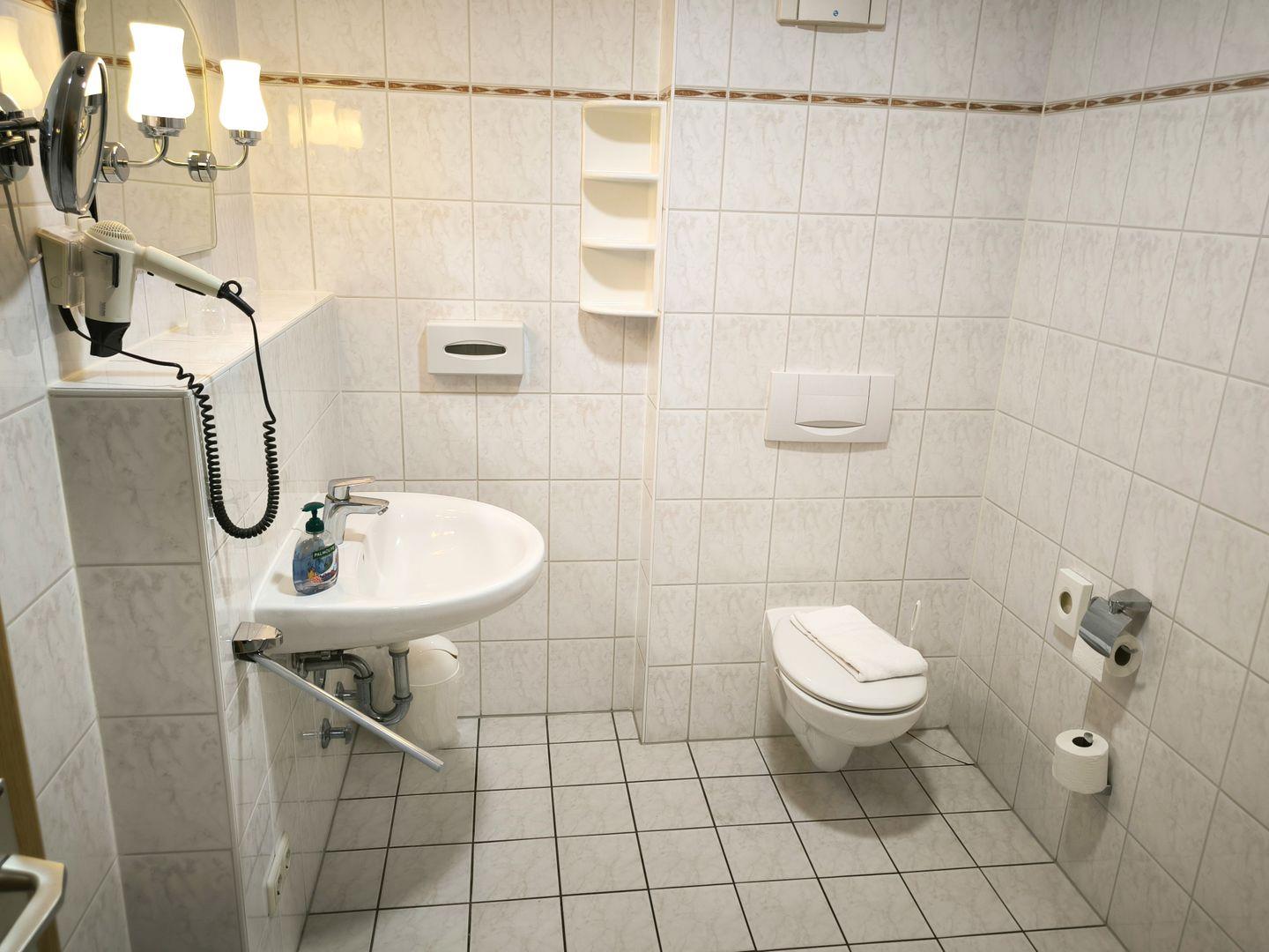 Bad mit Dusche, WC, Föhn und beleuchtetem Kosmetikspiegel