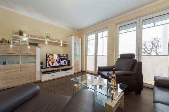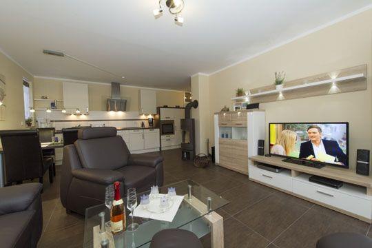 Wohnbereich mit Ledersitzgarnitur und Couchtisch, TV und CD-Radio, Esstisch mit 4 Stühlen und Kamin