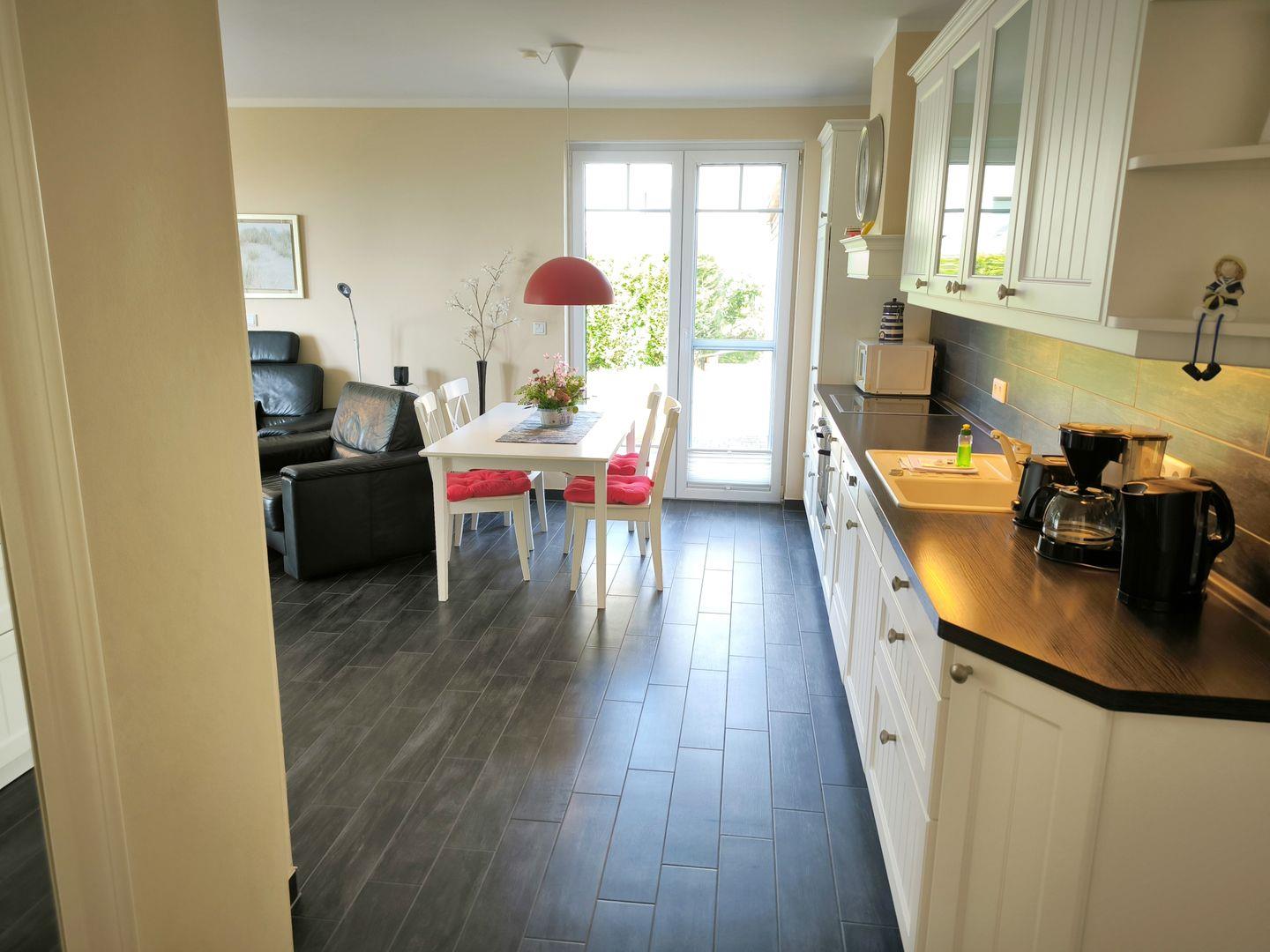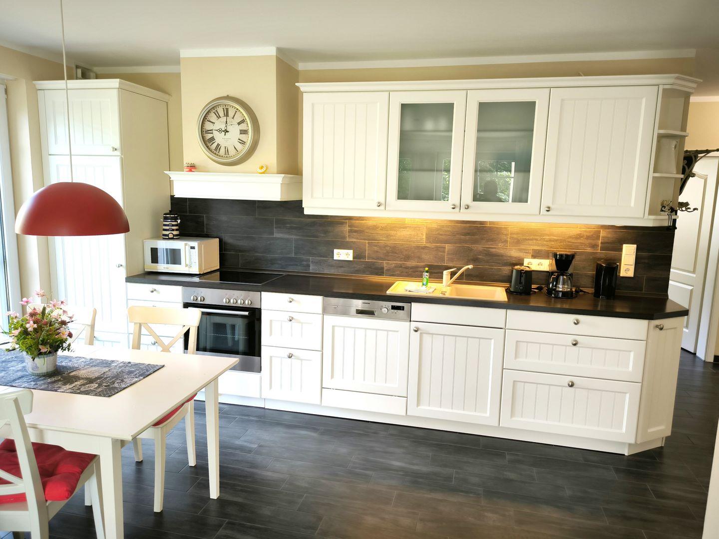 In den Wohnraum integrierte Einbauküche mit 4-Platten-Cerankochfeld, Backofen, Mikrowelle, großer Kühlschrank mit Gefrierfach, Geschirrspüler, Toaster, Kaffeemaschine, Wasserkocher und hochwertigen Küchenutensilien