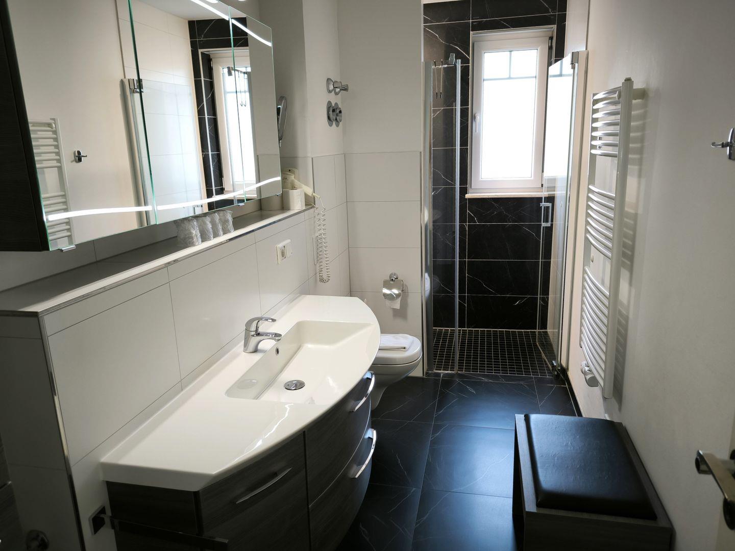 Bad mit großer ebenerdiger Dusche, Waschtisch, WC und Föhn