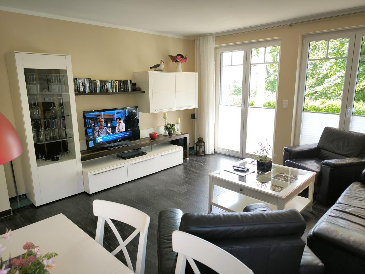 Großzügiger Wohnbereich mit Ledersitzgarnitur und Couchtisch, Anrichte mit großem Flat-TV, CD-Radio-Anlage und Esstisch mit 4 Stühlen