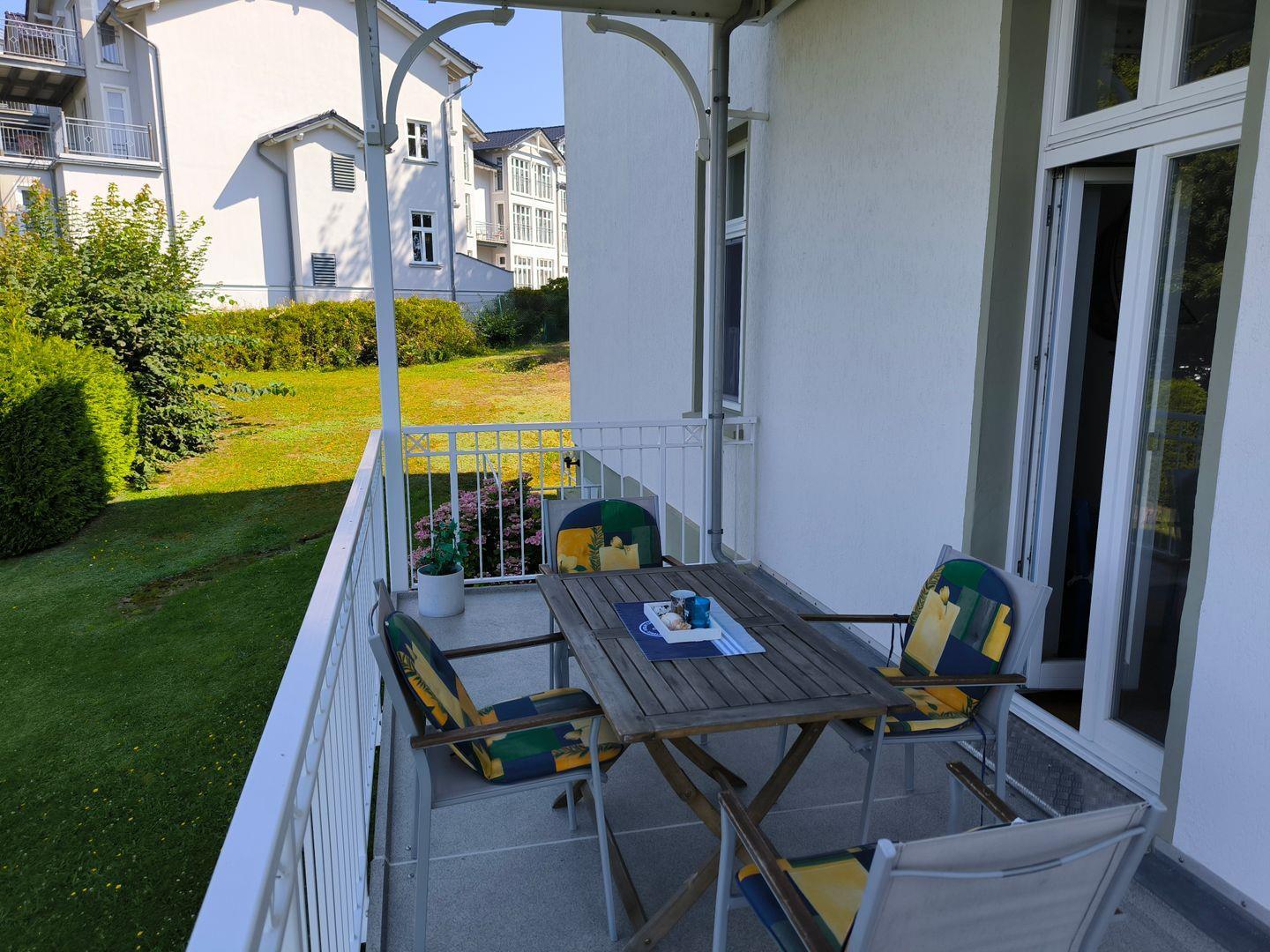 großer und überdachter Balkon mit Balkonmöbeln