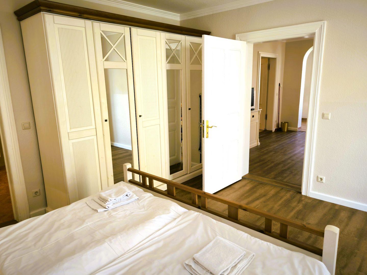 Schlafzimmer mit einem Doppelbett (180 x 200 cm), großem Kleiderschrank