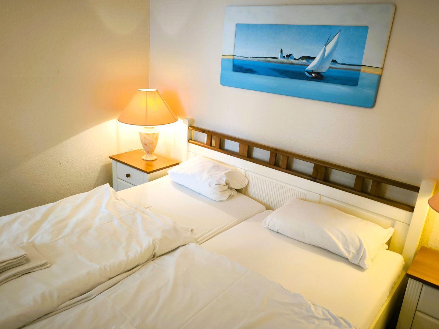 Schlafzimmer mit einem Doppelbett (180 x 200 cm), großem Kleiderschrank