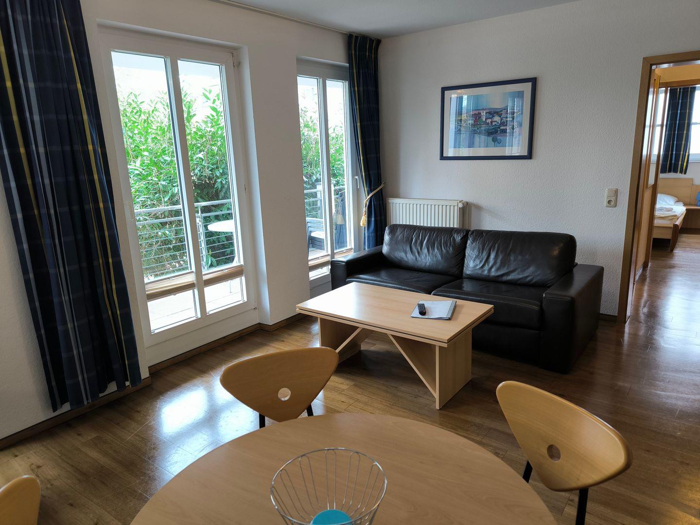 Wohnbereich mit ausziehbarer, moderner Doppelbettschlafcouch, Couchtisch mit Sesseln, Flat-TV mit Radiofunktion ,Esstisch mit 4 Stühlen