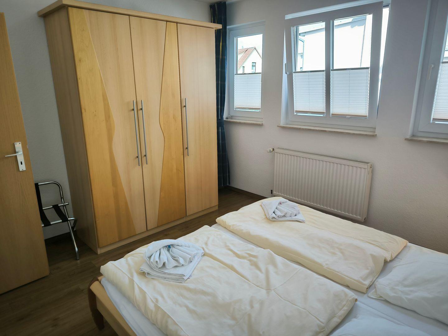 Schlafzimmer mit einem Doppelbett (180 x 200 cm) und großem Kleiderschrank,