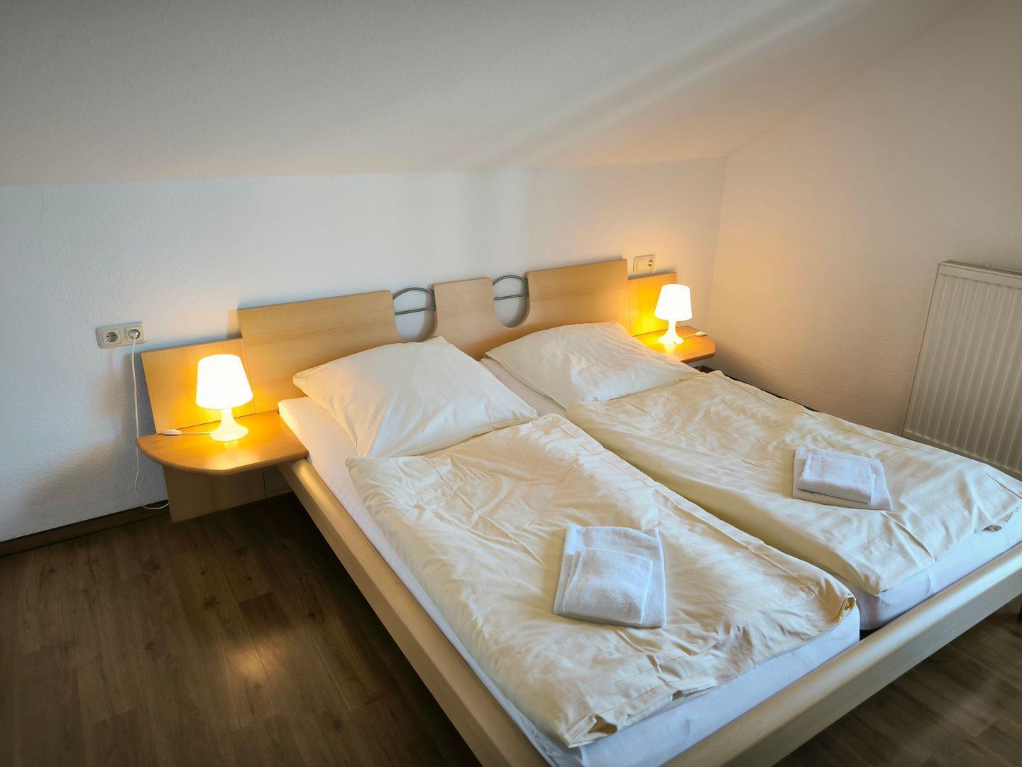 Schlafzimmer mit einem Doppelbett (180 x 200 cm) und großem Kleiderschrank, Kofferablage
