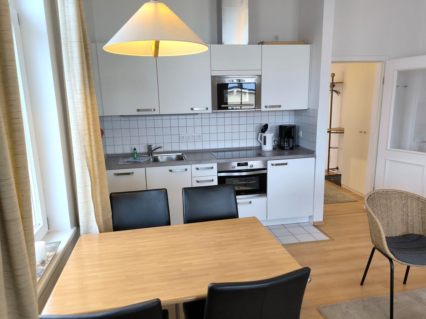 im Wohnraum integrierte Einbauküche mit 4- Platten- Kochfeld, Backofen, Kühlschrank, Mikrowelle, Geschirrspüler, Toaster, Kaffeemaschine, Wasserkocher und Küchenutensilien