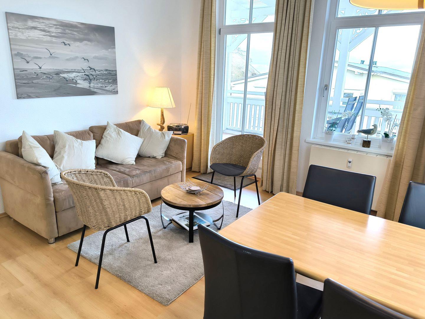 Wohnbereich mit moderner Wohnlandschaft, Couchtisch, TV (integr. Radio) und Esstisch mit 4 Stühlen