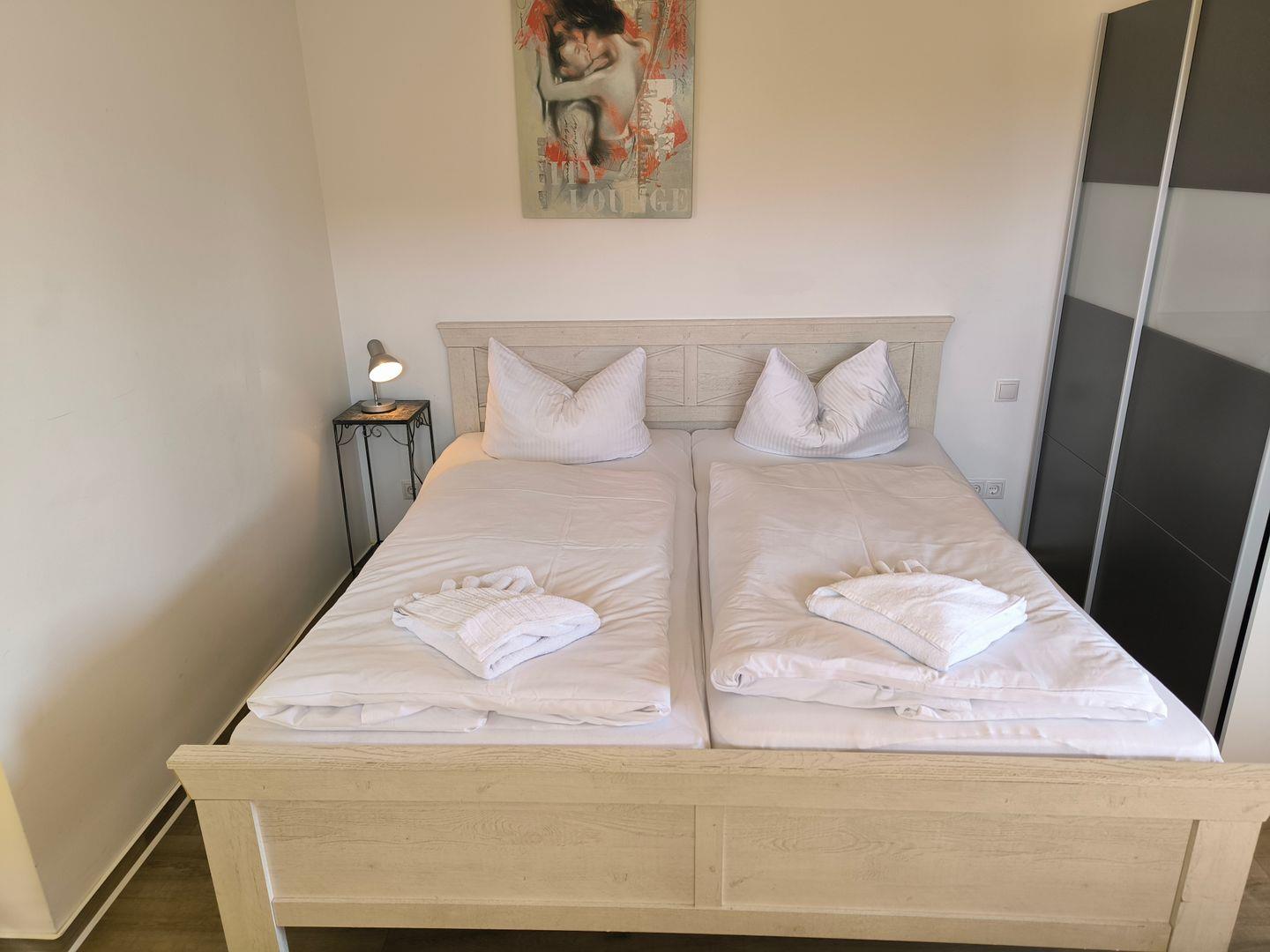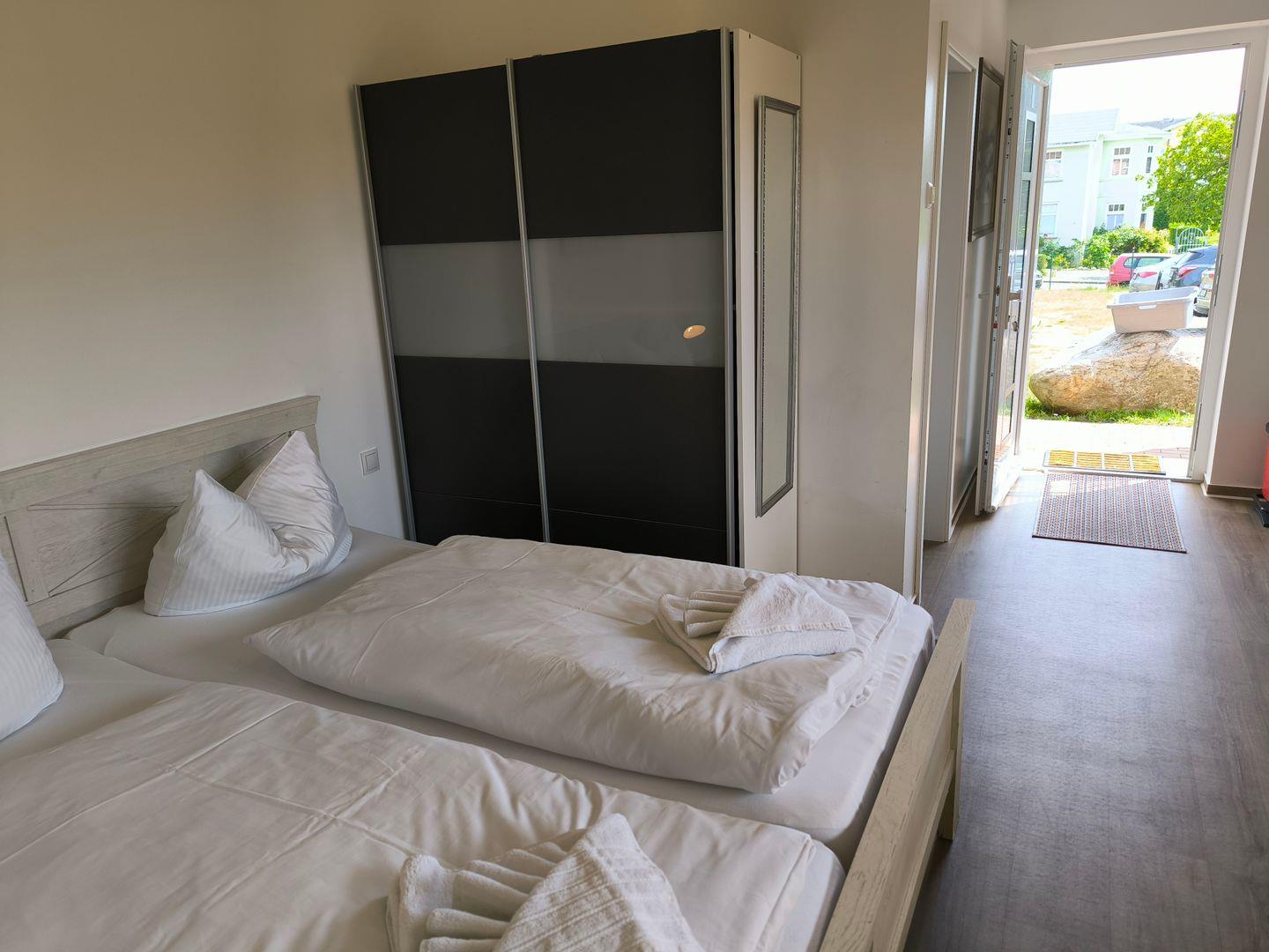 kombinierter Wohn-/ Schlafbereich mit Doppelbett ( 180×200 ) und Esstisch mit 2 Stühlen