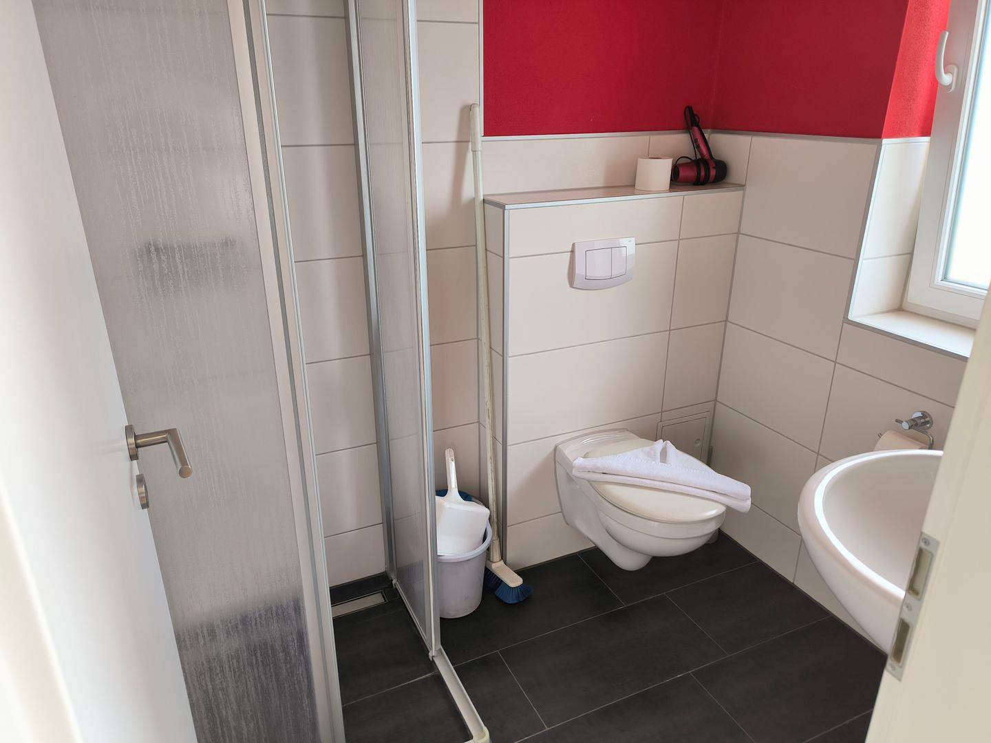 kleine integrierte Küchenzeile mit 2-Platten-Kochfeld, Backofen, Kühlschrank mit Gefrierfach, Toaster, Kaffeemaschine, Wasserkocher, diverse Küchenutensilien