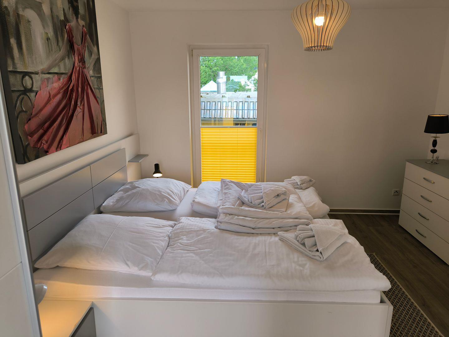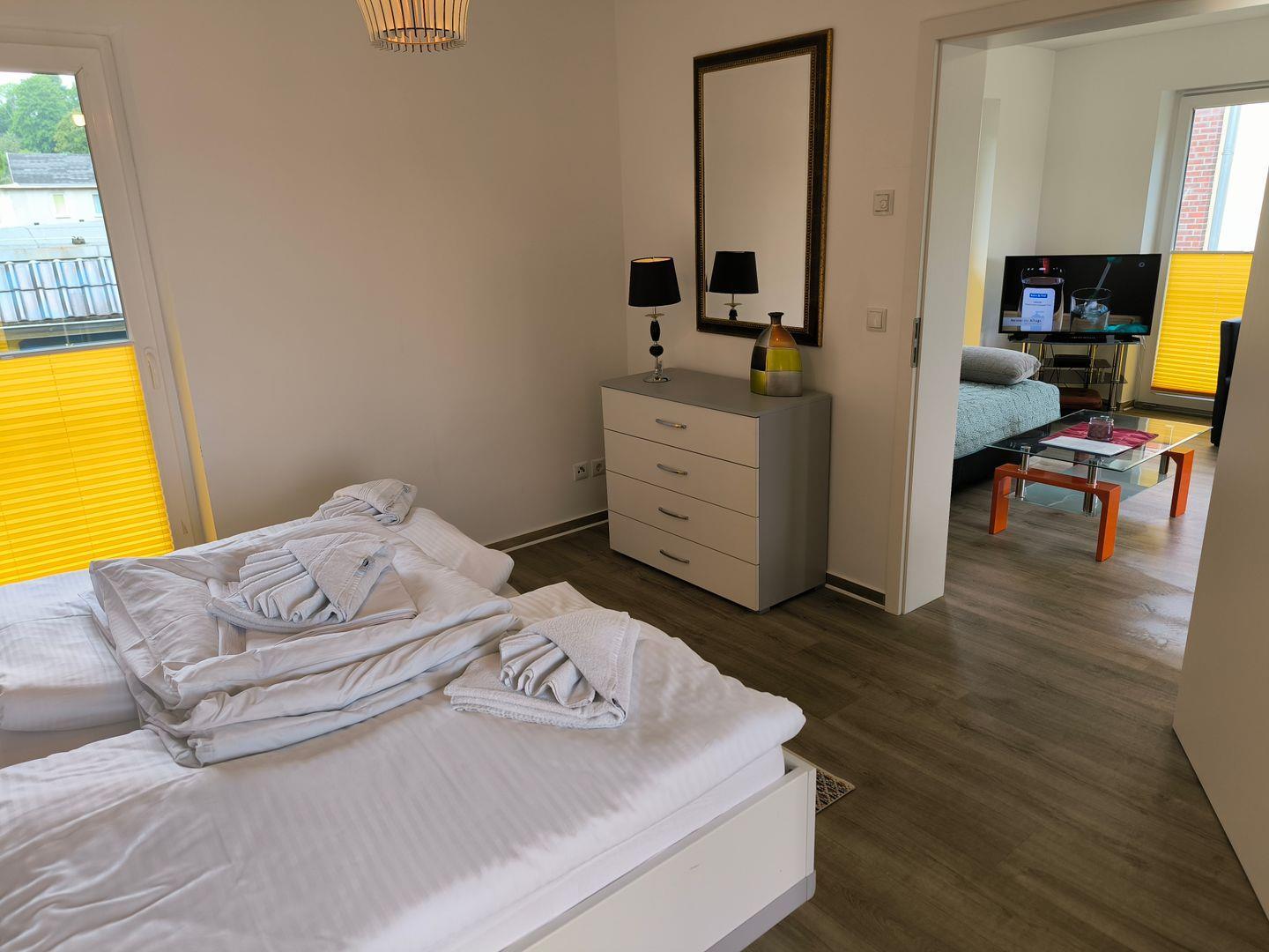Schlafzimmer mit Doppelbett (180x200cm) mit großen Kleiderschrank und Nachttisch