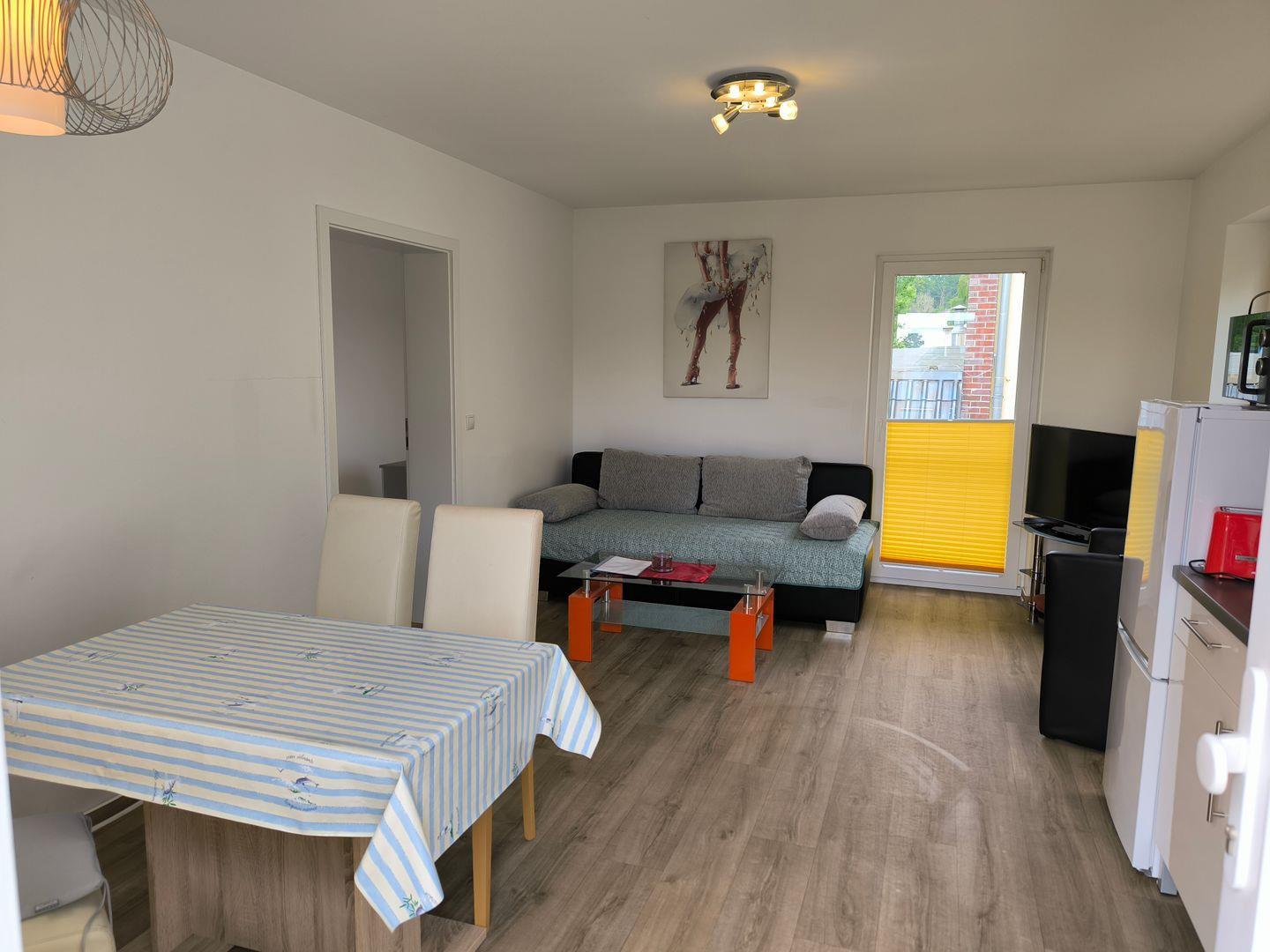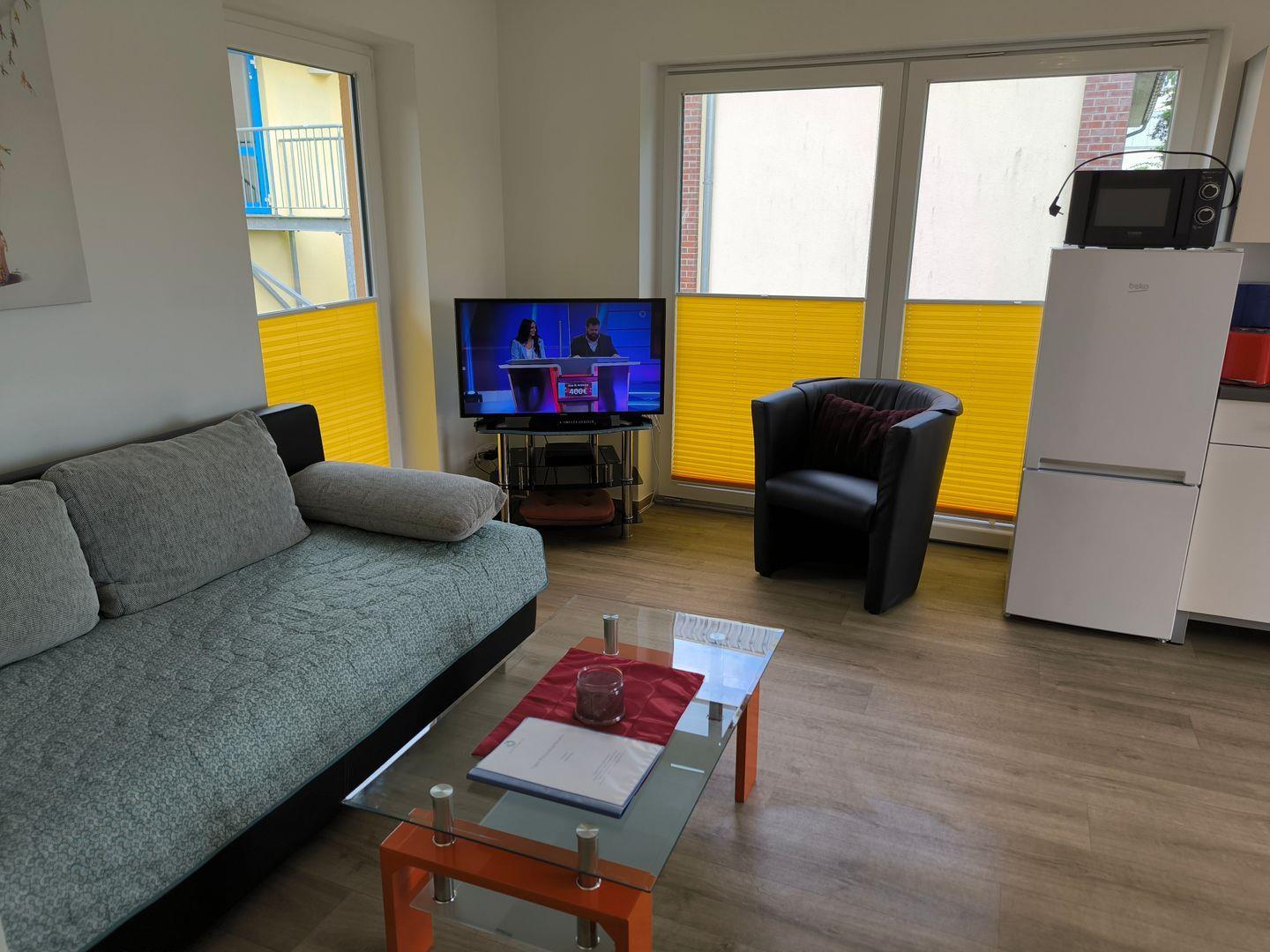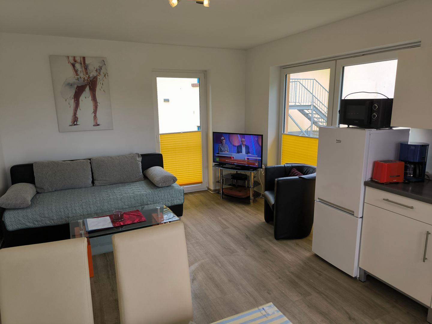 in den Wohnraum integrierte Küchenzeile mit 4-Platten-Ceran-Kochfeld, Backofen, Dunstabzugshaube, Kühlschrank mit Gefrierfach, Mikrowelle, Toaster, Kaffeemaschine, Wasserkocher, diverse Küchenutensilien