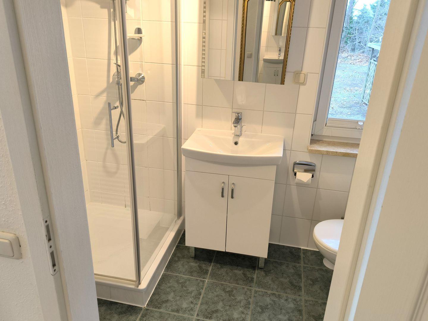 Das Badezimmer ist mit einer offenen Dusche, einem WC, einem Waschbecken und einem Spiegel ausgestattet, alles in ansprechendem Zustand und bereit für Ihre Nutzung. Für zusätzlichen Komfort sorgt die Gasheizung, die das Haus auch in kälteren Monaten angenehm warm hält.
