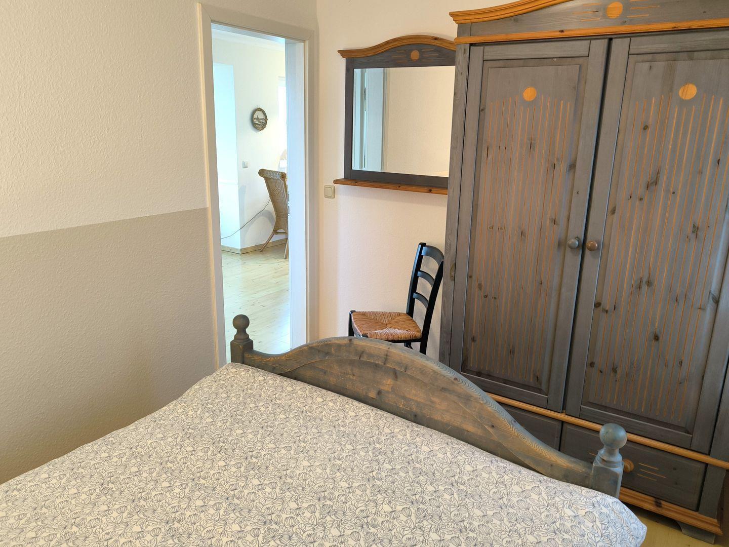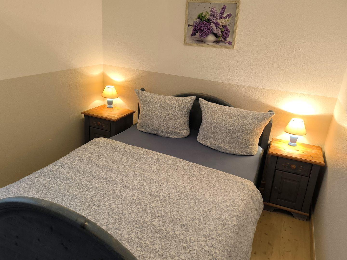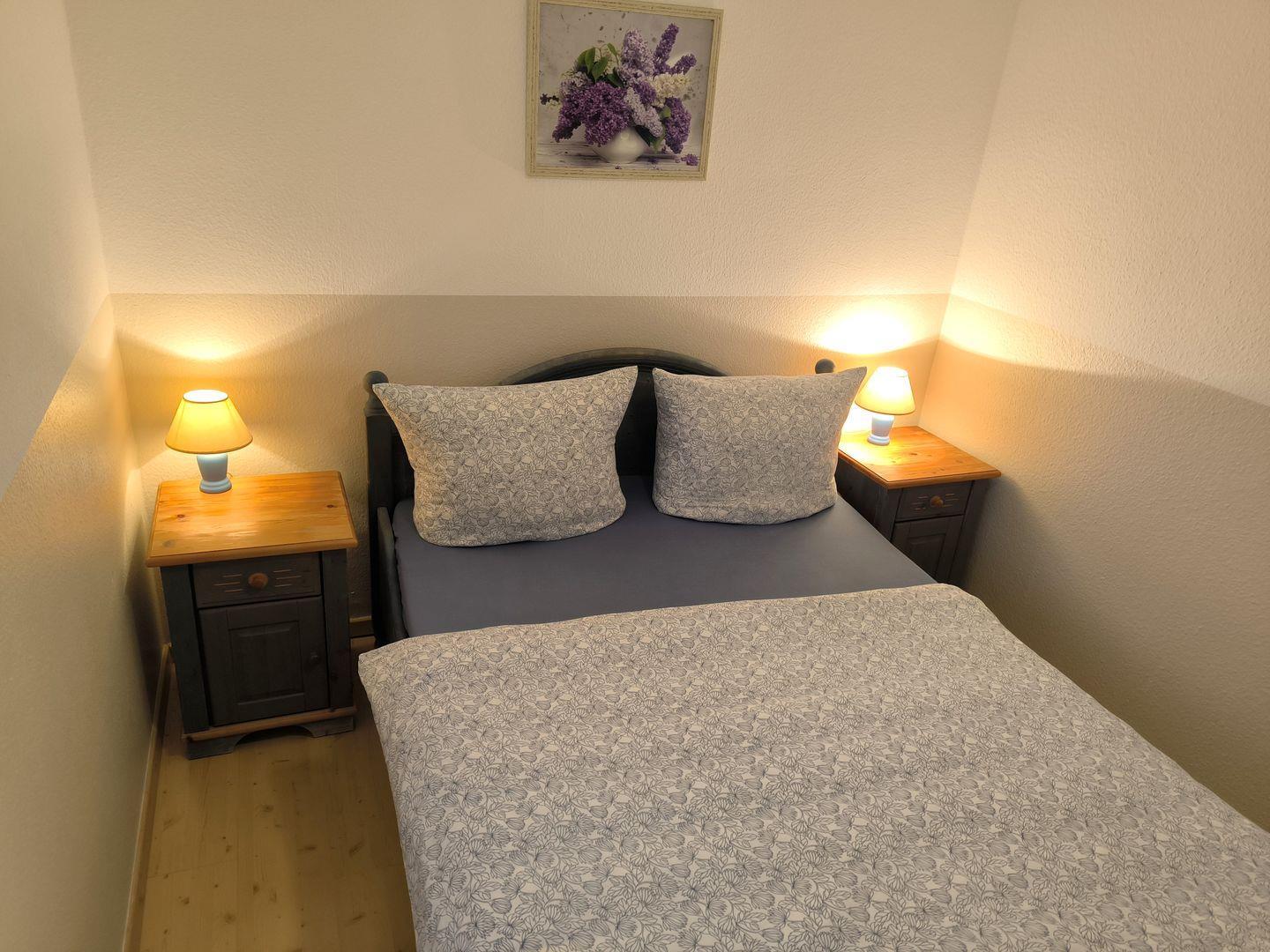 Die Ferienwohnung verfügt über ein Schlafzimmer mit bequemen Schlafmöglichkeiten für zwei Personen. Der offene Wohnbereich ist mit einer gemütlichen Sofaecke ausgestattet, die zum Verweilen einlädt. Hier können Sie entspannte Abende verbringen und den digitalen Kabel-TV nutzen, um Ihre Lieblingssendungen zu schauen. Das Wohnzimmer geht direkt in die kleine Küche über, die mit allem Notwendigen ausgestattet ist, einschließlich einem Zweiplattenherd, Kühlschrank mit Gefrierfach, Kaffeemaschine sowie Geschirr und Besteck. Ein Esstisch bietet ausreichend Platz für gemeinsame Mahlzeiten oder Spieleabende.