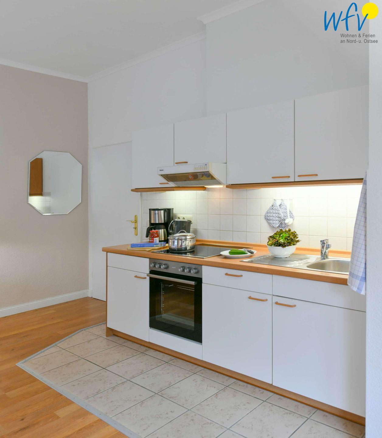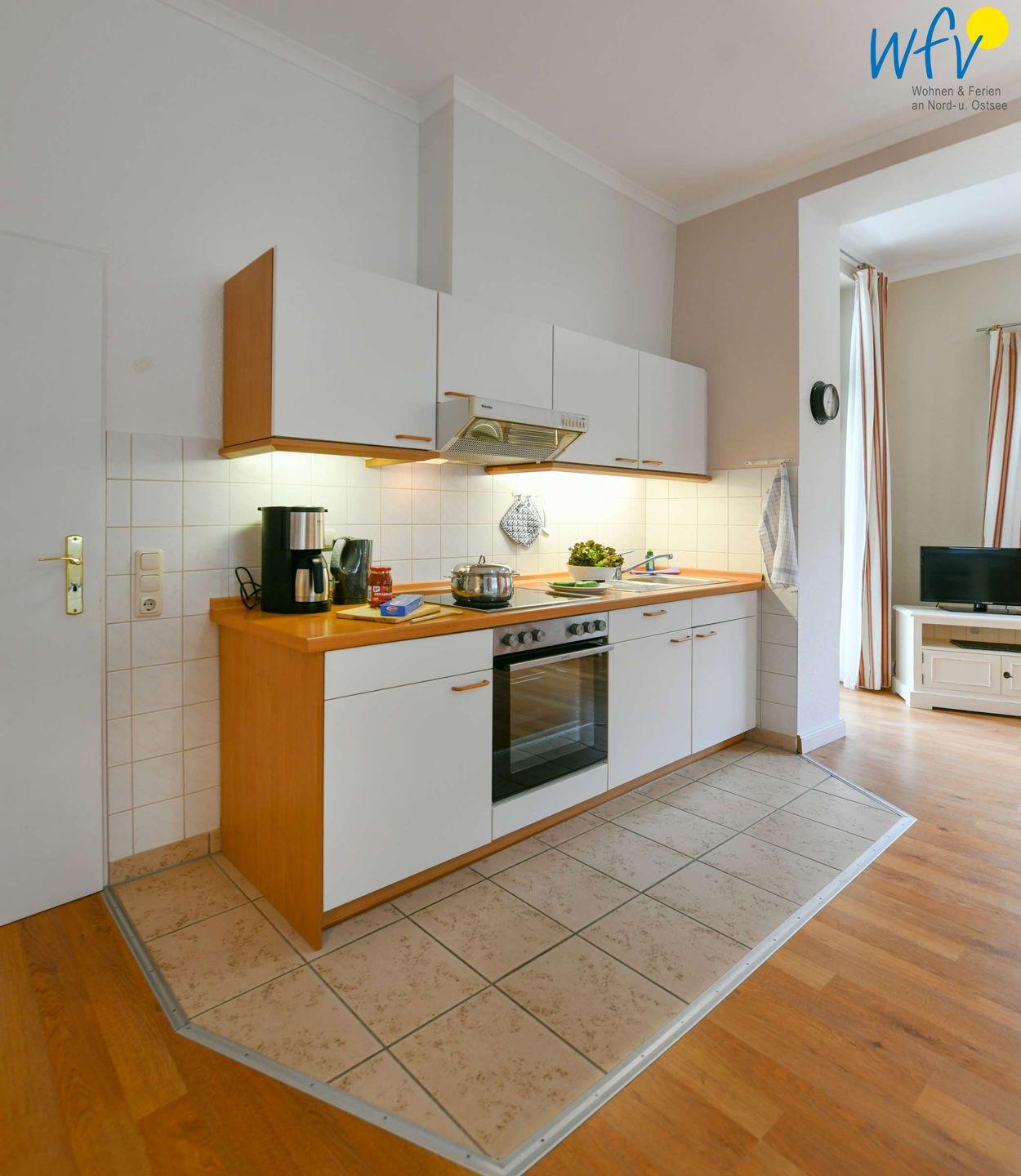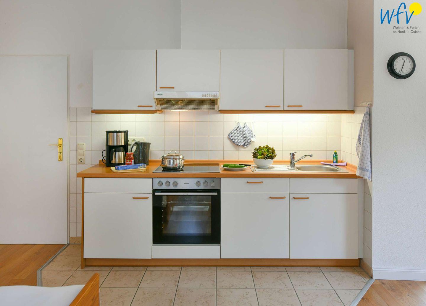 Für eine bequeme Selbstverpflegung ist die Küchenzeile der Ferienwohnung u.a. mit einem 4-Plattenherd, Backofen und Kühlschrank mit Gefrierfach sowie Kaffeemaschine, Wasserkocher und Toaster ausgestattet.