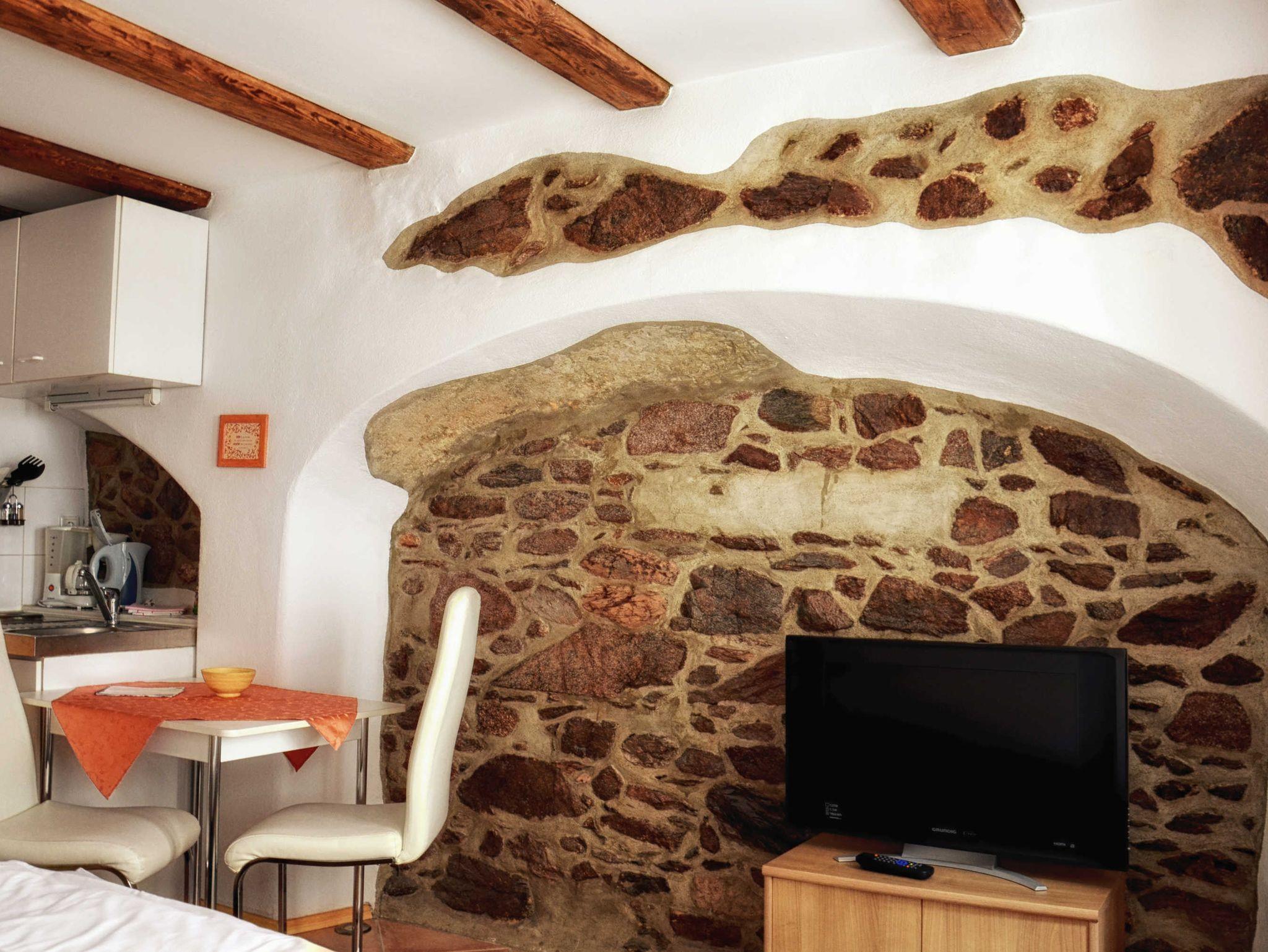 NEISSE Einraum-Apartment ist ein gemütliches Zimmer mit freigelegter historischer Mauer. Das geräumige Bad mit Dusche und der Wohn-/Schlafraum mit integrierter Singleküche bieten Unterkunft für ein bis zwei Personen. Im Sommer laden die romantischen Sitzecken im Garten des Hauses ein, einen erlebnisreichen Tag ausklingen zu lassen.