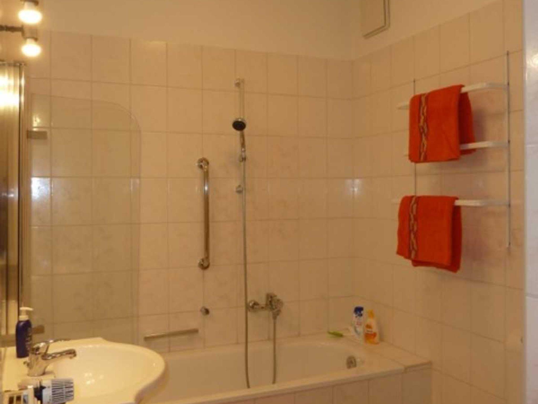 Das Badezimmer verfügt über eine Badewanne mit Duschtrennwand.