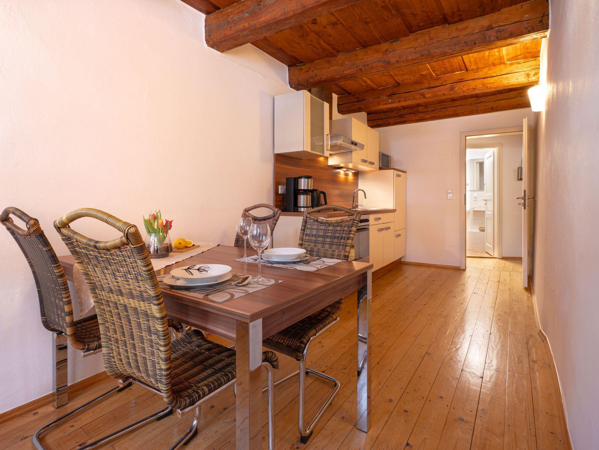 Eine elegante Wohnung unter historischer Holzbalkendecke mit Wohn-/Schlafraum, Bad und Wanne finden Sie im ersten Obergeschoss. Die Ferienwohnung Altstadtbrücke bietet Unterkunft für bis zu vier Personen. Aus der schönen Wohnküche sehen Sie in den gepflegten Garten mit lauschigen Sitzecken und können den Sonnenuntergang hinter der Peterskirche beobachten.