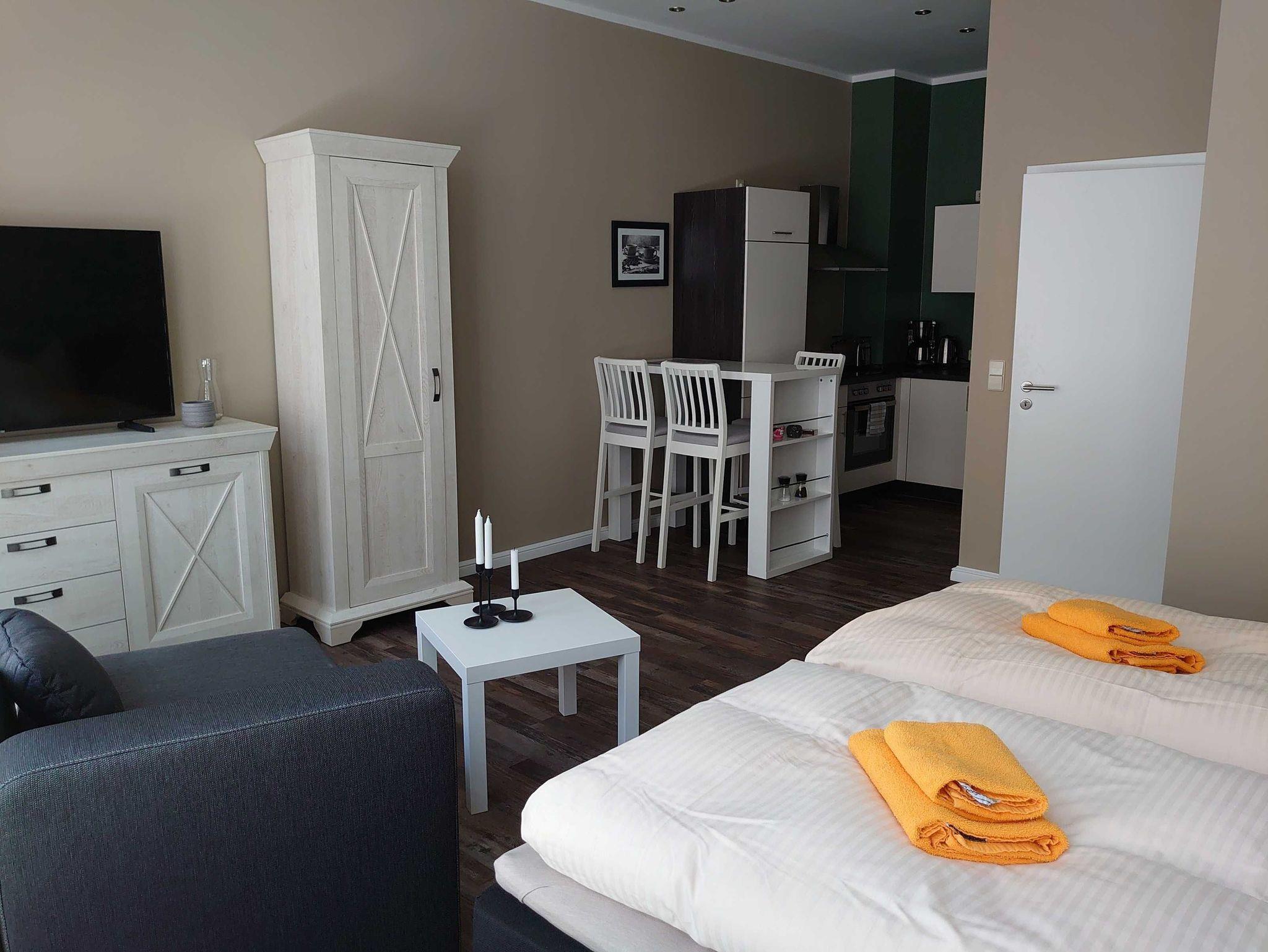 Die kleine Ferienwohnung ist in der ersten Etage gelegen und komplett ausgestattet. Sie verfügt über einen Wohn-/Schlafraum mit einer offenen Küche und ein modernes Bad.
