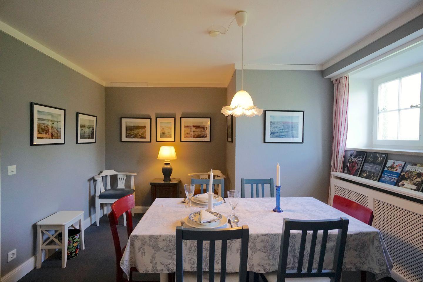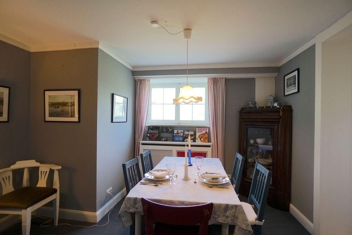 Dass Esszimmer ist für bis zu 8 Personen geeignet. Sessel und Bücher bewirken in Verbindung mit der Küche ein „Wohnküchen-Gefühl“.
