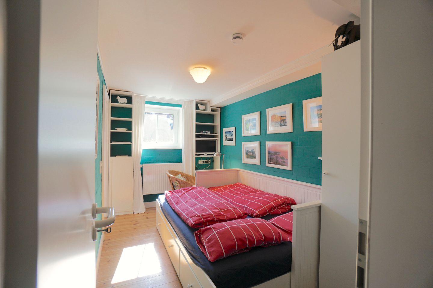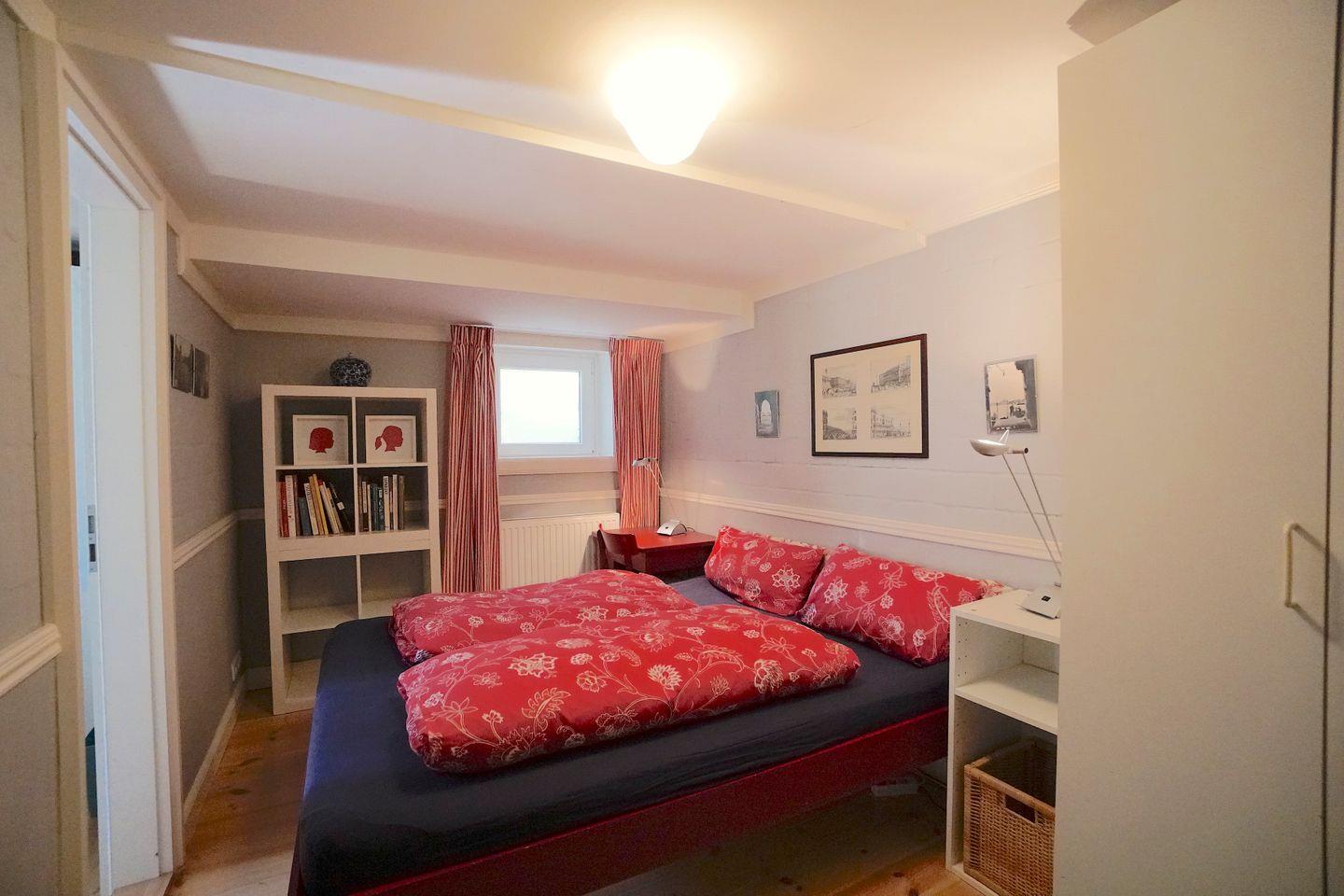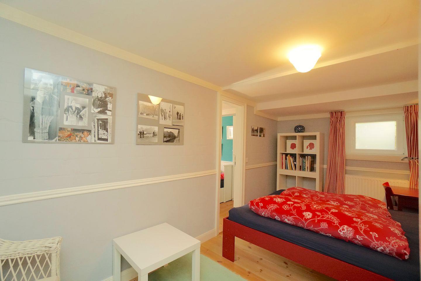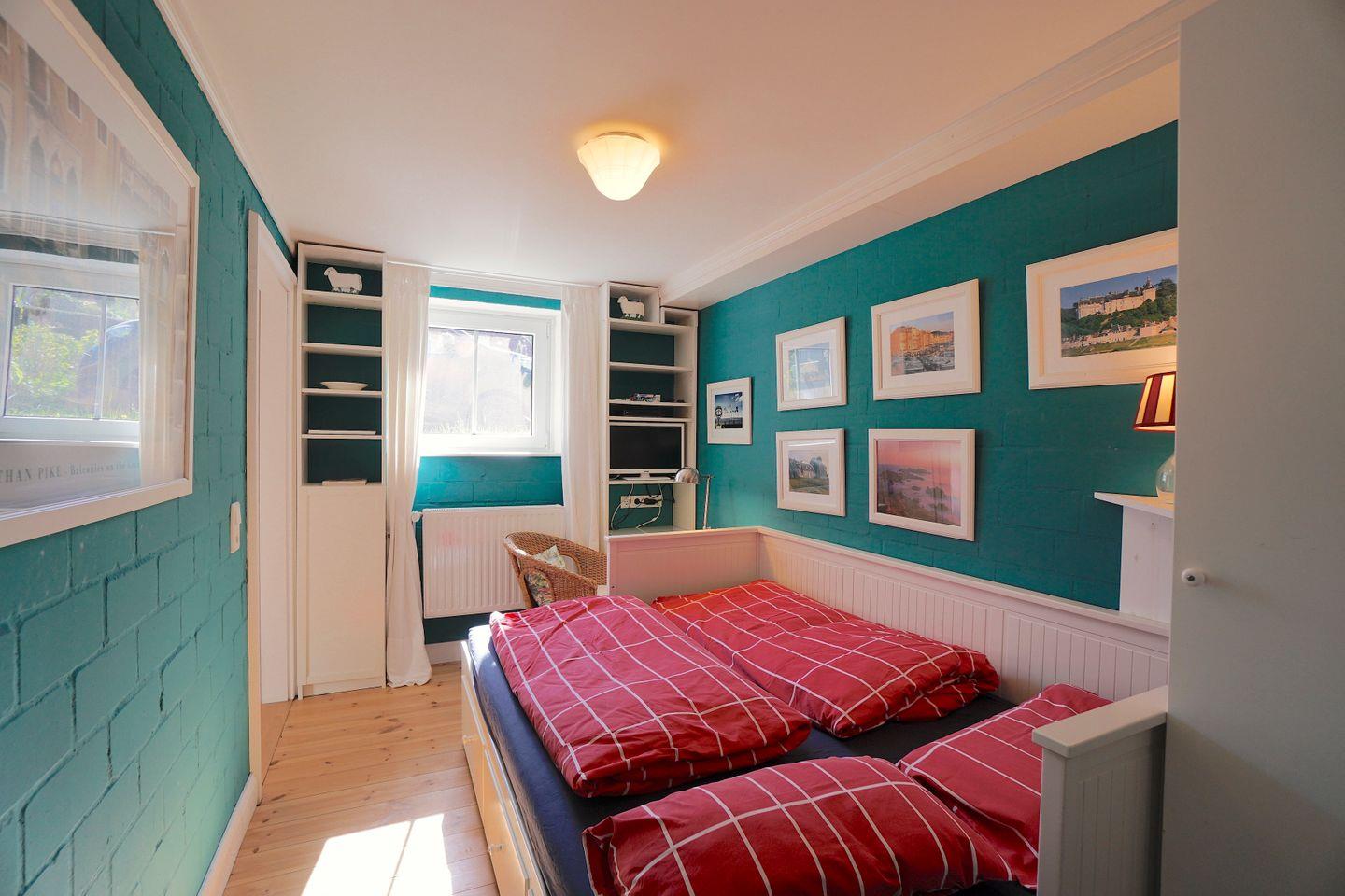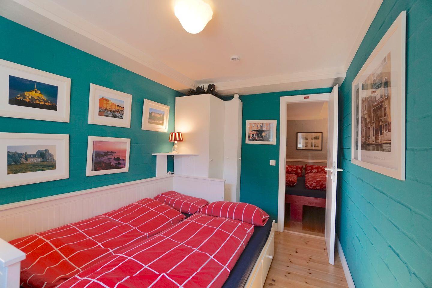 Das „Rote Zimmer“ hat ein Doppelbett (s. o.), kleinen Schreibtisch, Kleiderschrank, Kommode, Sessel und Bücherregal.