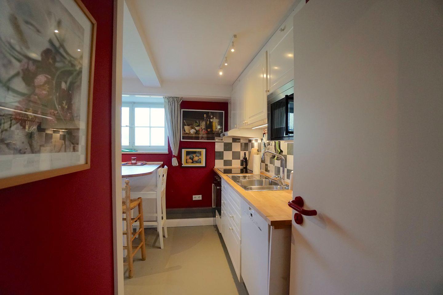 Die Küche ist nicht sehr groß, aber perfekt ausgestattet mit Miele-Geschirrspülmaschine, Mikrowelle, Kühl- / Gefrierkombination, Abzug nach außen, Ess-/Arbeitstisch mit 3 Plätzen.