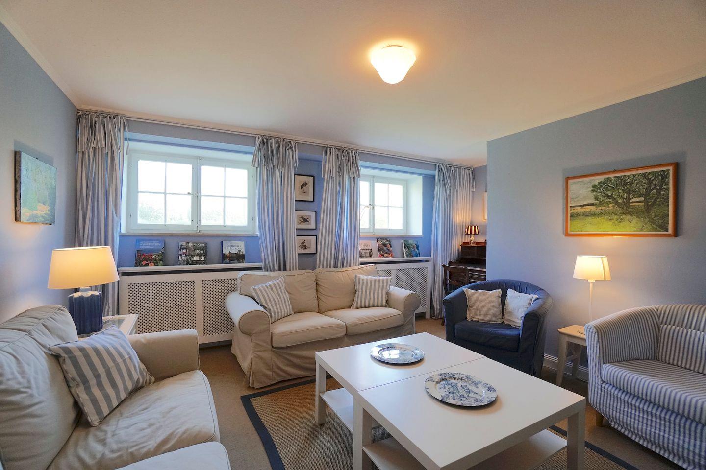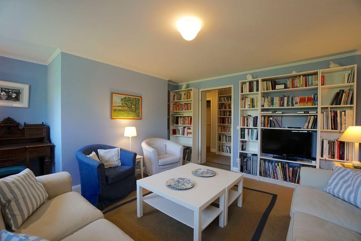 Das Wohnzimmer „reicht“ für alle Gäste und hat TV wie auch einen Schreibtisch.