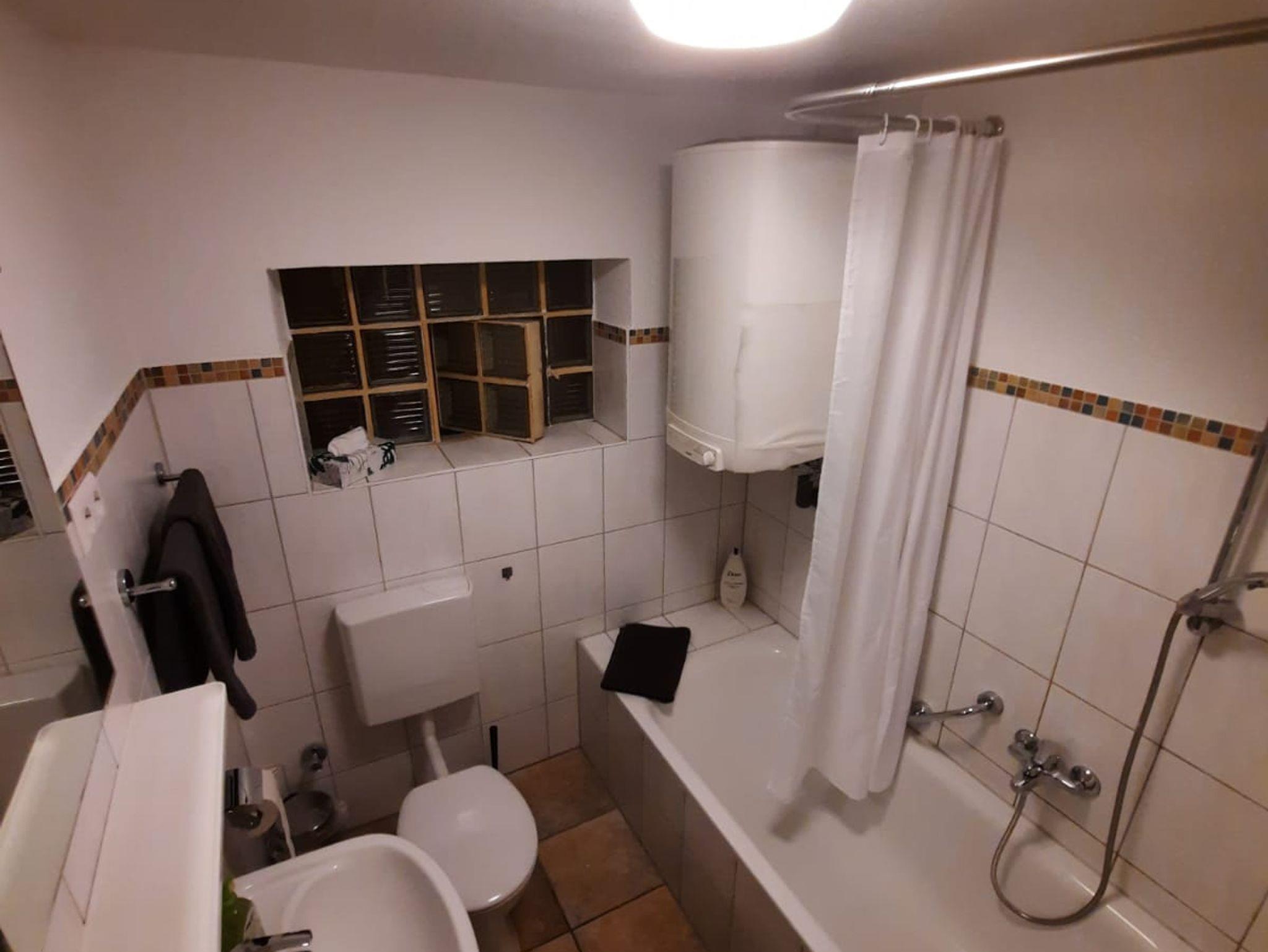 Das kleine Bad mit Waschbecken, Spiegel, Badewanne mit Duschmöglichkeit (Duschvorhang) und WC ist Funktional.