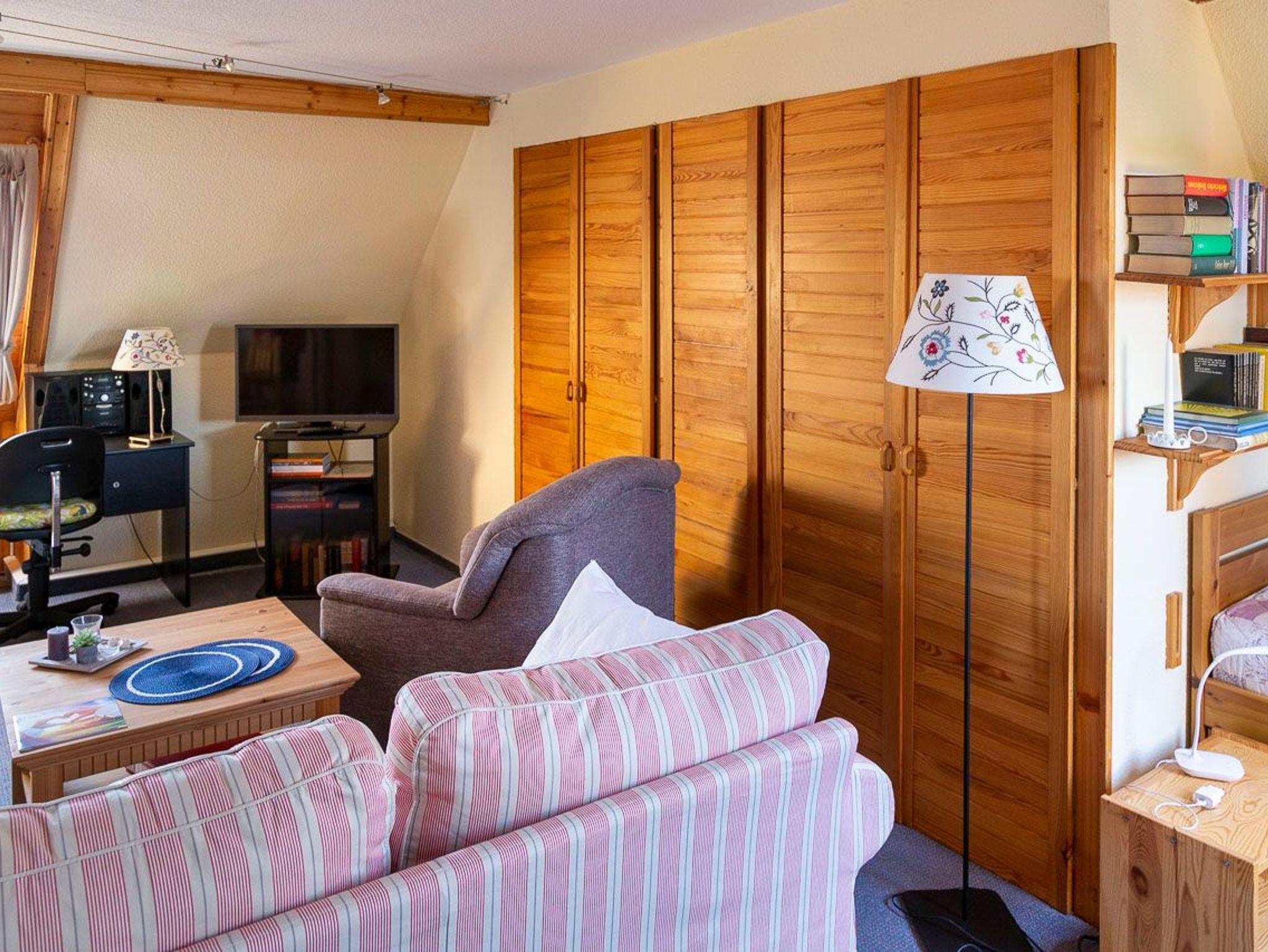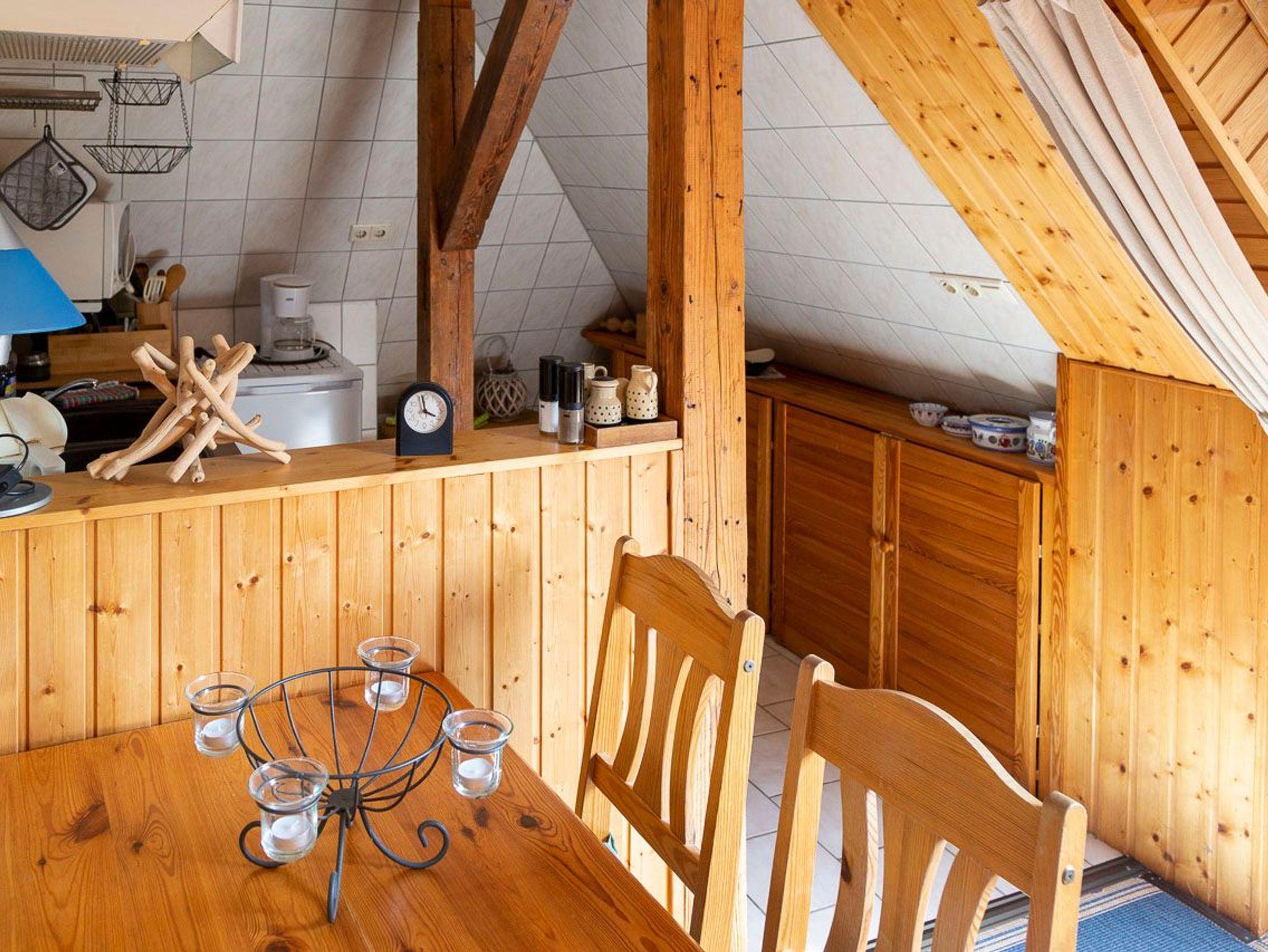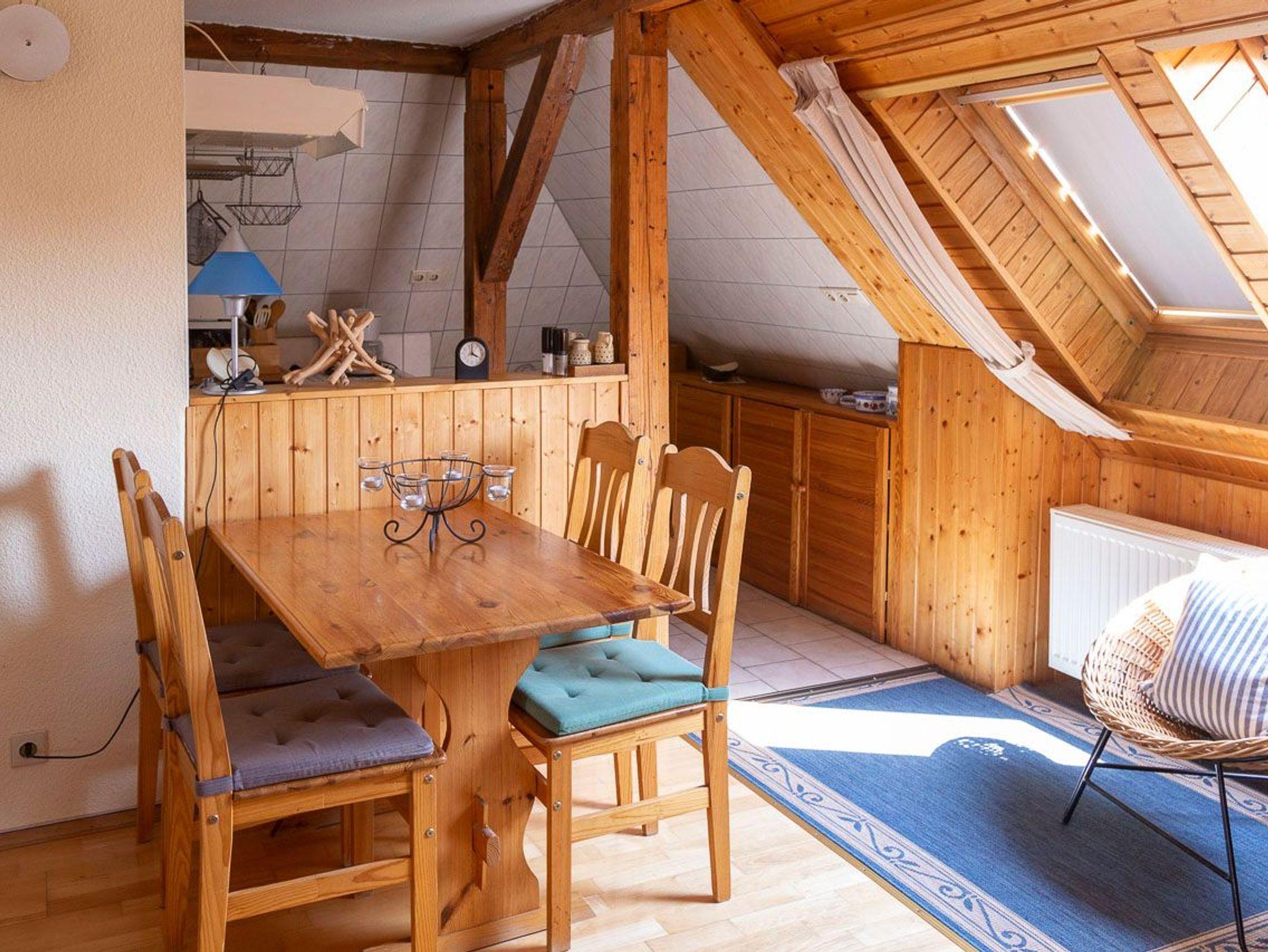 Ferienwohnung im Frühjahr 2006 frisch renoviert - neuer Teppichbelag, 2 Schlafliegen, begehbarer Kleiderschrank, Eßecke, offene Küche, Bad mit Badewanne und WC, Treppe zum offenen Hems mit Doppelbettcouch. Dachwohnung mit Dachbalken. Helle und freundliche Ausstattung mit Holz und Korbmöbeln.
