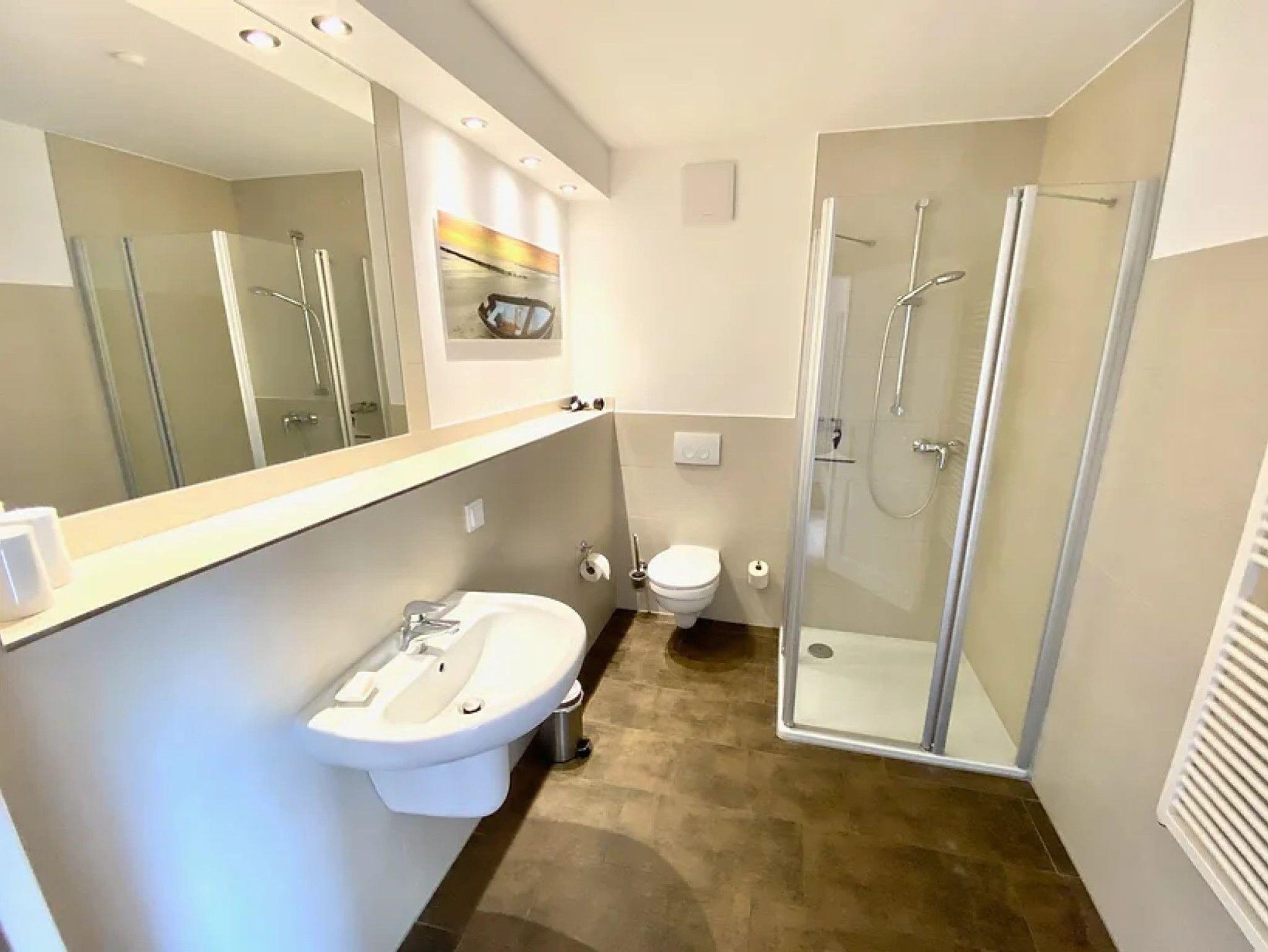 • Badezimmer mit Dusche, beheiztem Handtuchhalter und teilweise Tageslicht