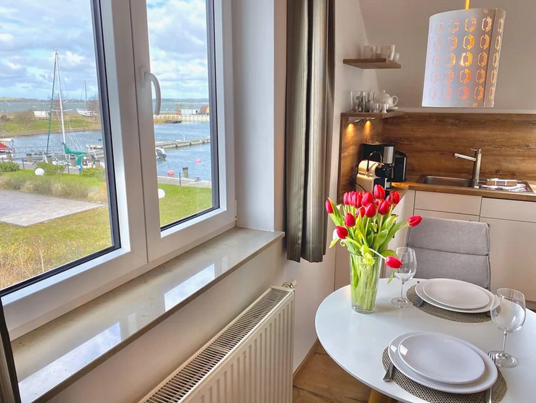 Das ca. 21-26 qm große Ferienstudio STANDARD befindet sich im Erdgeschoss oder Obergeschoss und bietet einen Blick auf den Jachthafen oder auf die Zicker Berge. Die Wohnung eignet sich für 1-2 Personen.