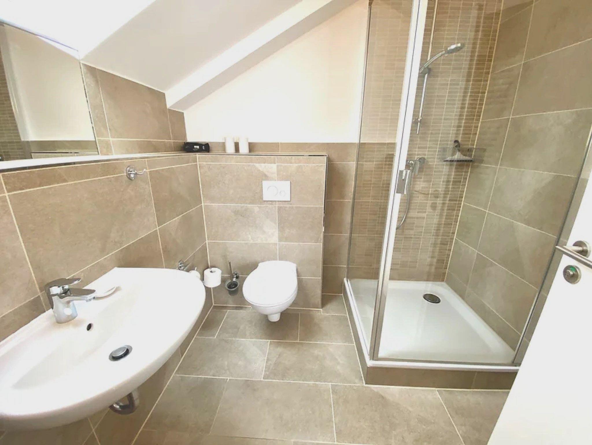 • Badezimmer mit Dusche, beheiztem Handtuchhalter und teilweise Tageslicht