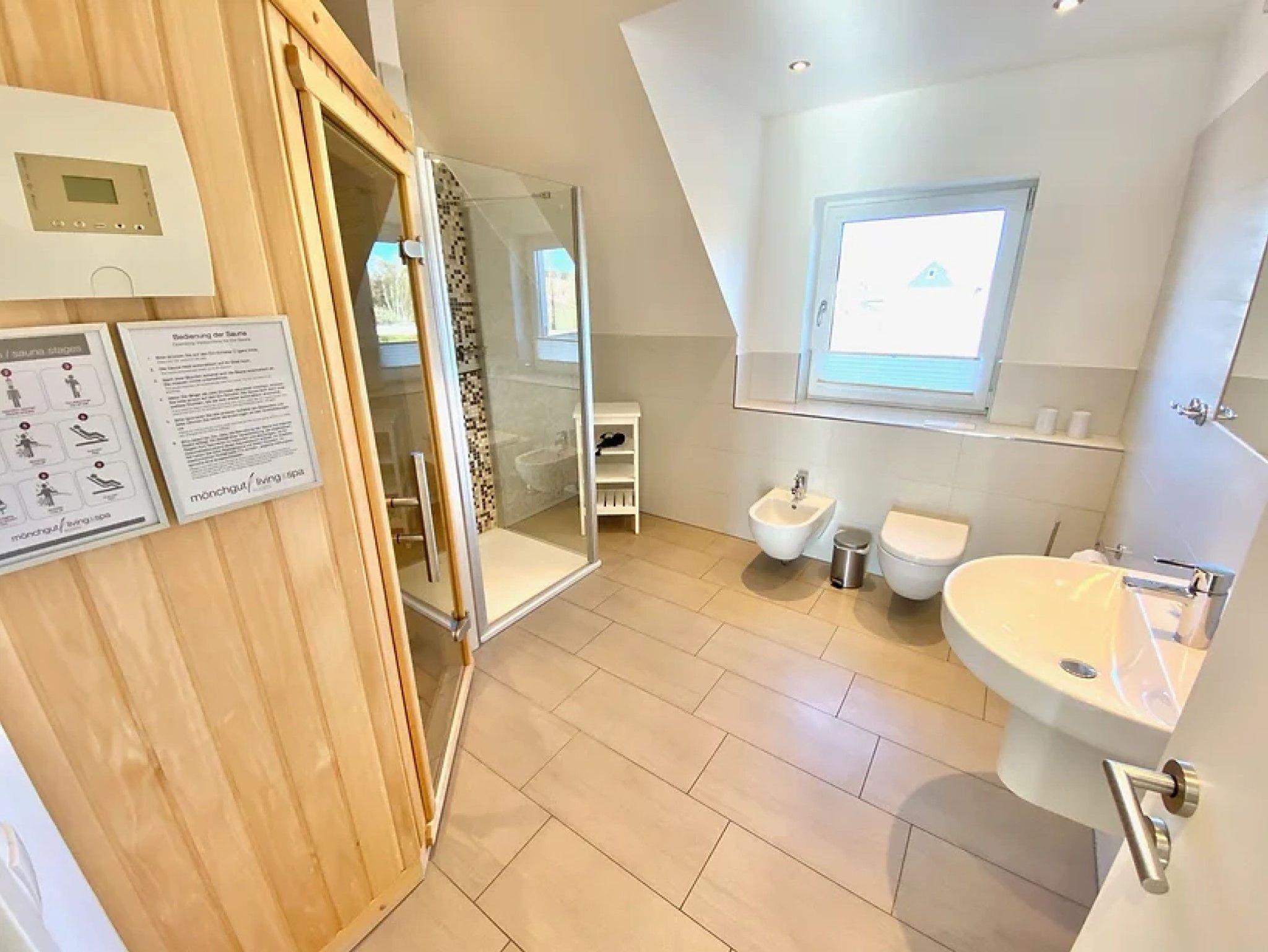 • Badezimmer (11 qm) mit ebenerdiger Dusche, Bidet, beheiztem Handtuchhalter, Fußbodenheizung und Tageslicht