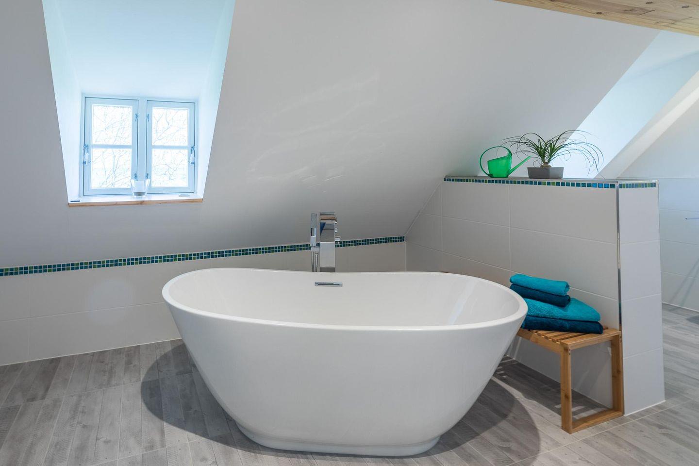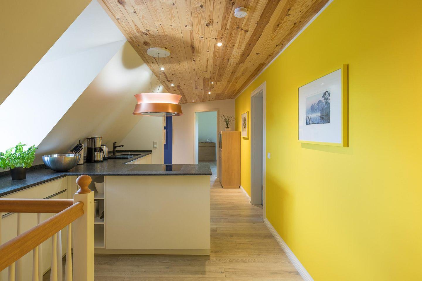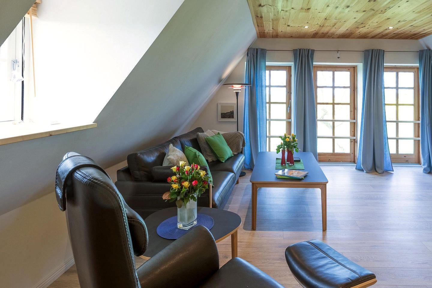 Die großzügige und hochwertig eingerichtete Wohnung befindet sich im 1. Obergeschoss eines Reetdach Anwesens und ist über eine breite Holztreppe erreichbar.