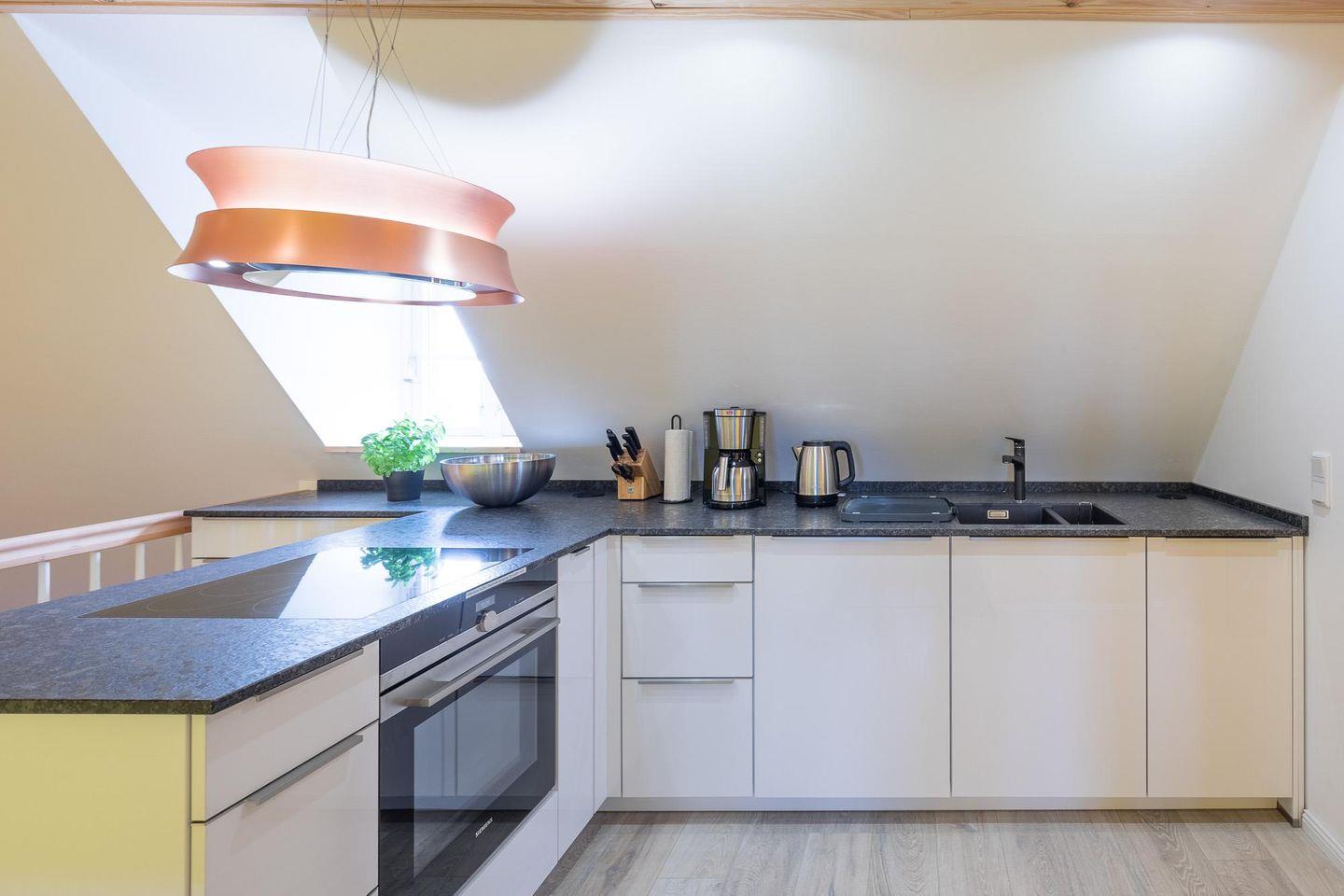 Die Küche ist ein komfortabel eingerichtetes Betätigungsfeld für Hobbyköche. Die Küche bietet einen Herd mit 4-Platten-Ceranfeld und Backofen mit integrierter Mikrowelle, einen Kühlschrank mit Gefrierfach, eine Geschirrspülmaschine, eine Kaffeemaschine (Filtergröße 4), und ist mit Toaster, Mixer, Wasserkocher und Geschirr ausgestattet.