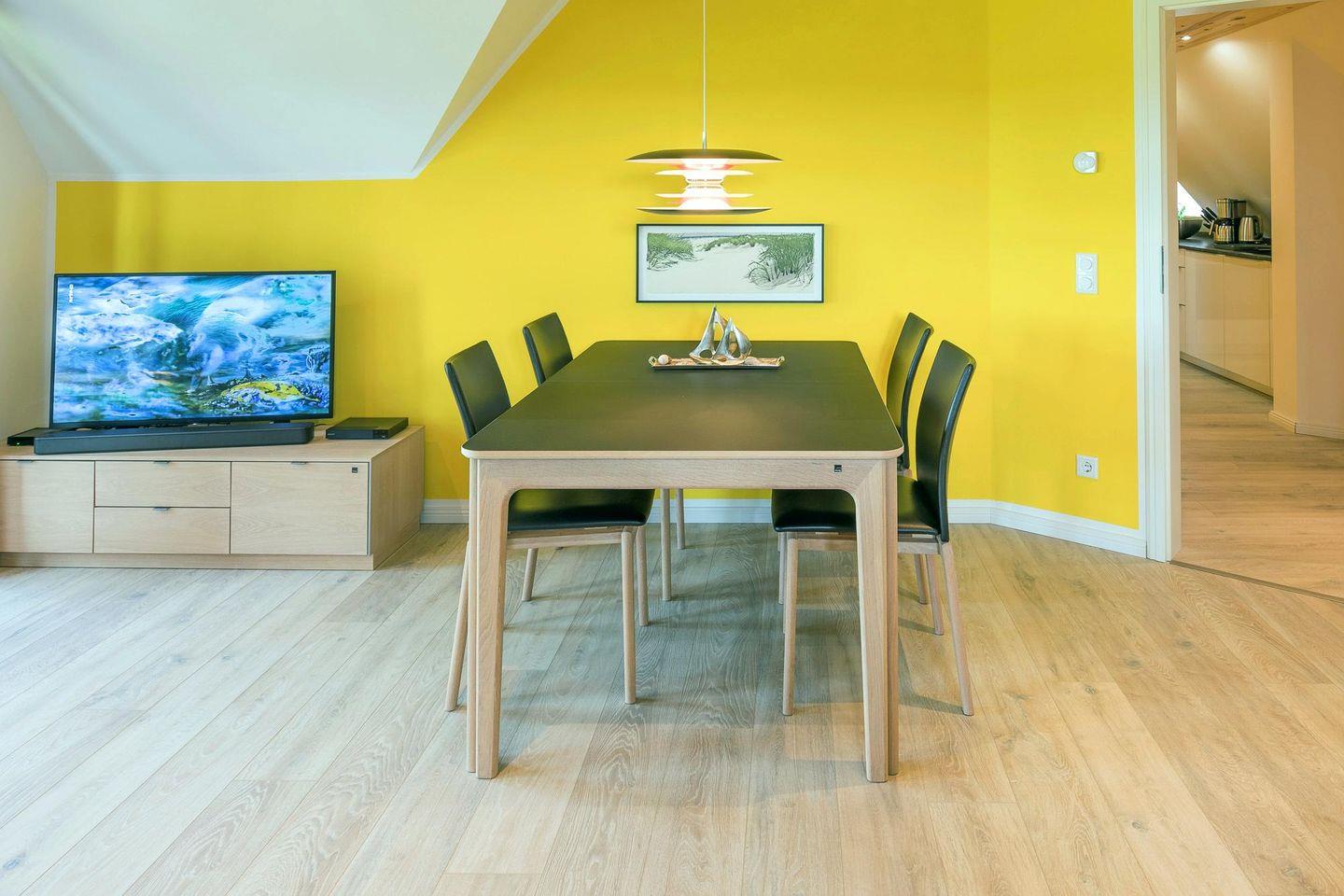 Im großzügigen Wohnbereich bieten ein Sofa und ein Komfort-Sessel Bequemlichkeit mit fantastischem Weitblick auf den Seedeich. Über einen Glasfaseranschluss stehen Ihnen ein kostenfreier WLAN-Zugang und Kabel-TV zur Verfügung. Ein Blu-ray/DVD-Player ist vorhanden. Zum Musikhören verbinden Sie Ihr Handy über Bluetooth mit der Soundbar.