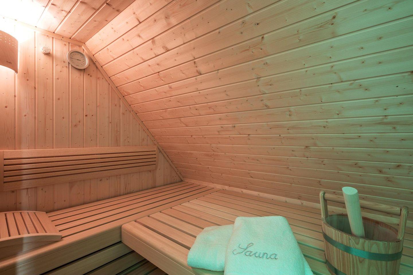 Eine Sauna mit einem besonders milden und angenehmen Sanarium-System steht Ihnen neben einem exklusiv eingerichteten Badezimmer mit Doppelwaschbecken, frei stehender Badewanne und einer ebenerdigen Großraum-Regendusche zur Verfügung.