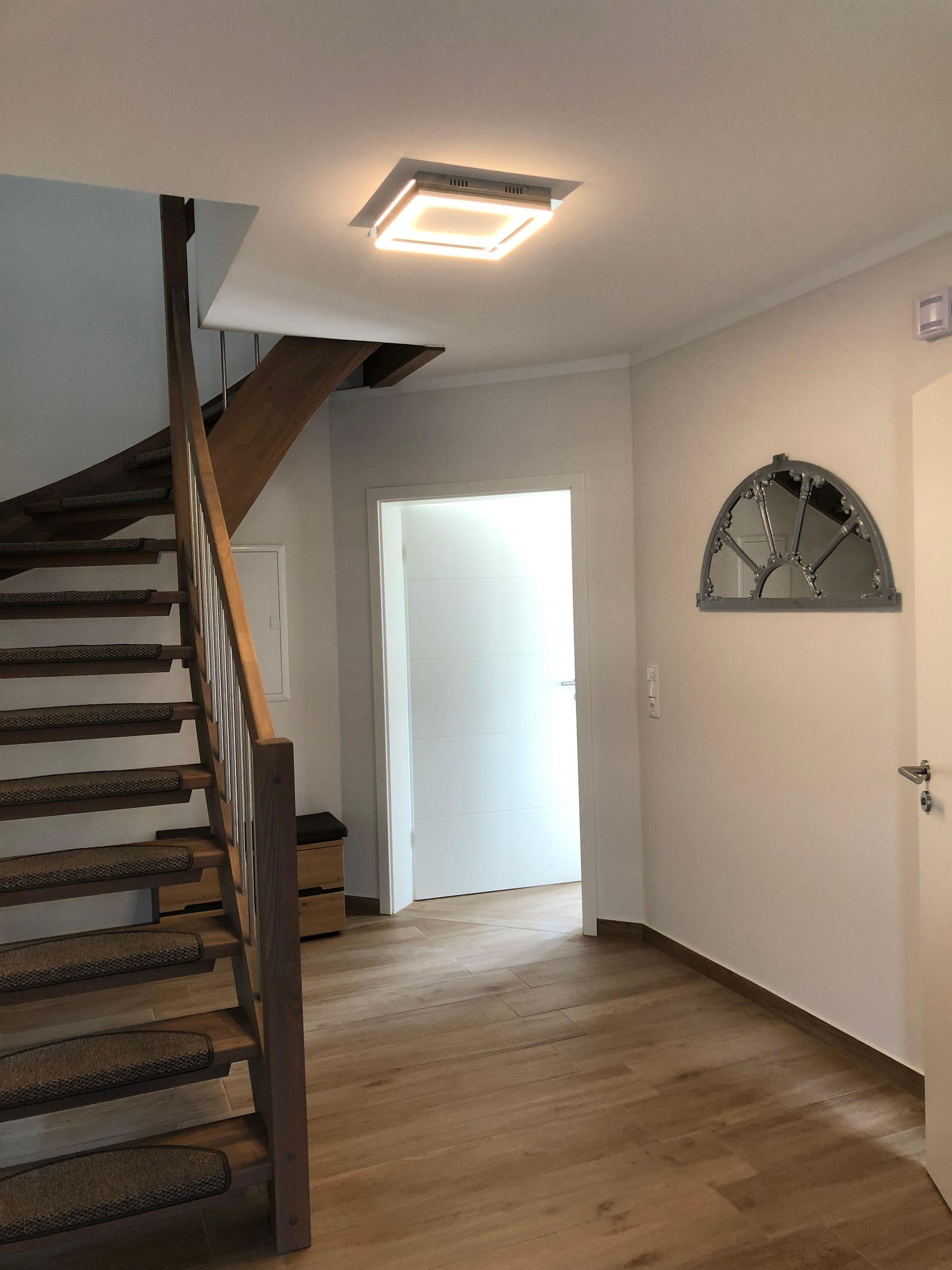 Alle Schlafräume und der Flur im Obergeschoss sind mit Echtholz-Fußboden ausgestattet. Wohn- und Essbereich, sowie Flur sind mit modernen, pflegeleichten Fliesen in Holzoptik ausgestattet. Das Bad besticht durch den anthrazit-farbigen Boden und die hellen Wände.