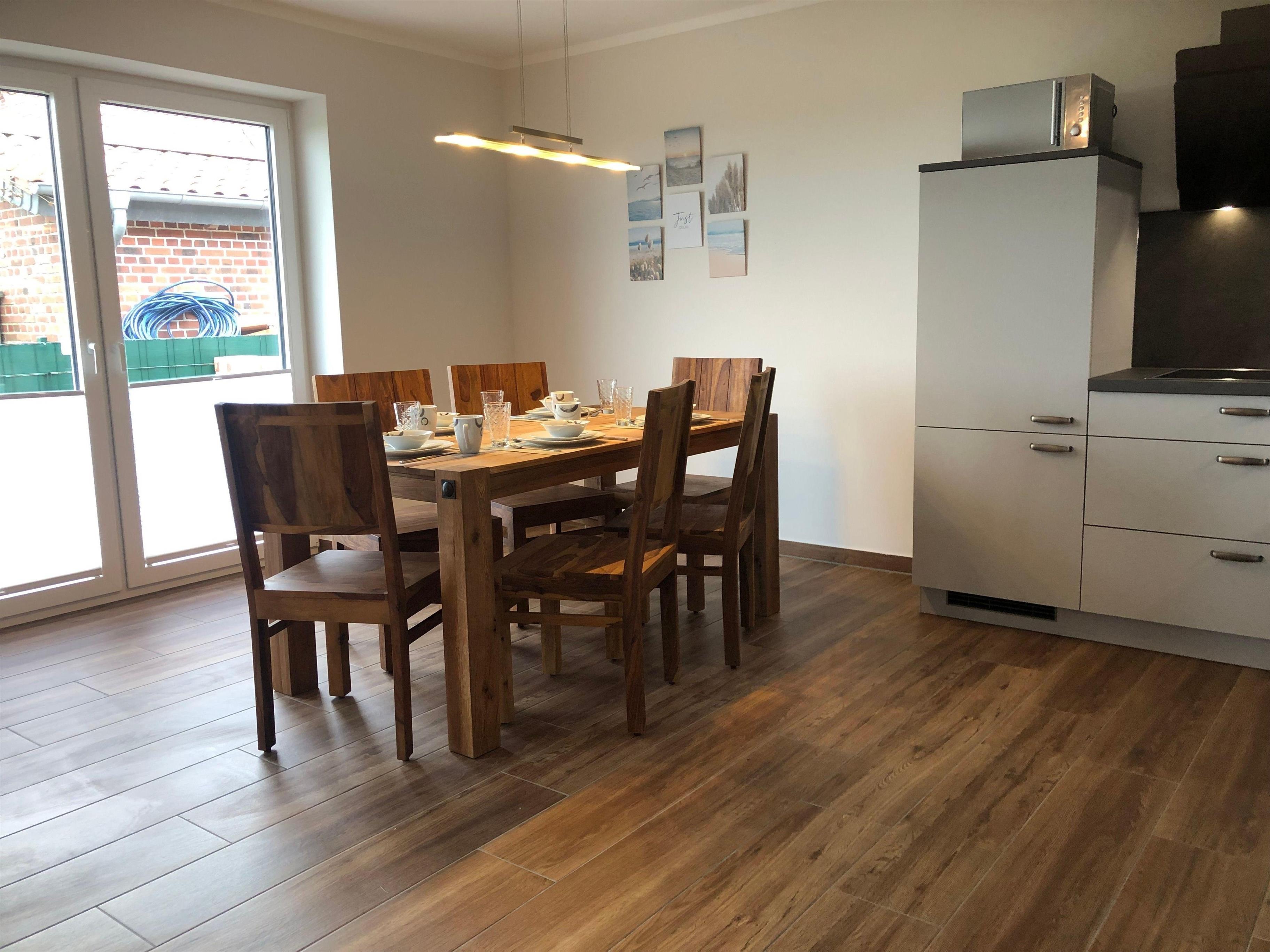Das große Wohn- und Esszimmer mit offener Küche schließt direkt an die Südterrasse an. Die voll ausgestattete Küche und die modernen Vollholzmöbel sorgen für eine gemütliche Atmosphäre.