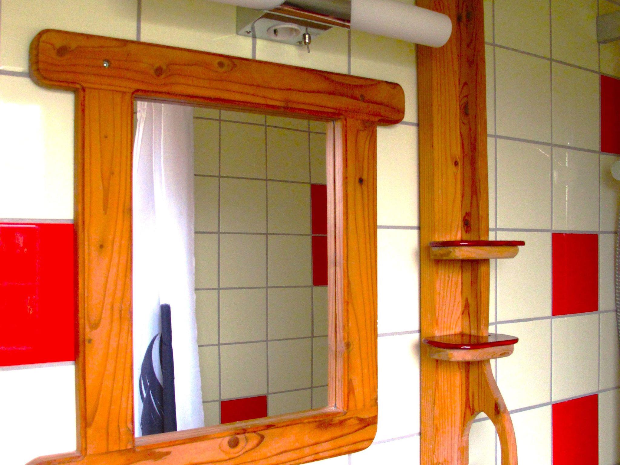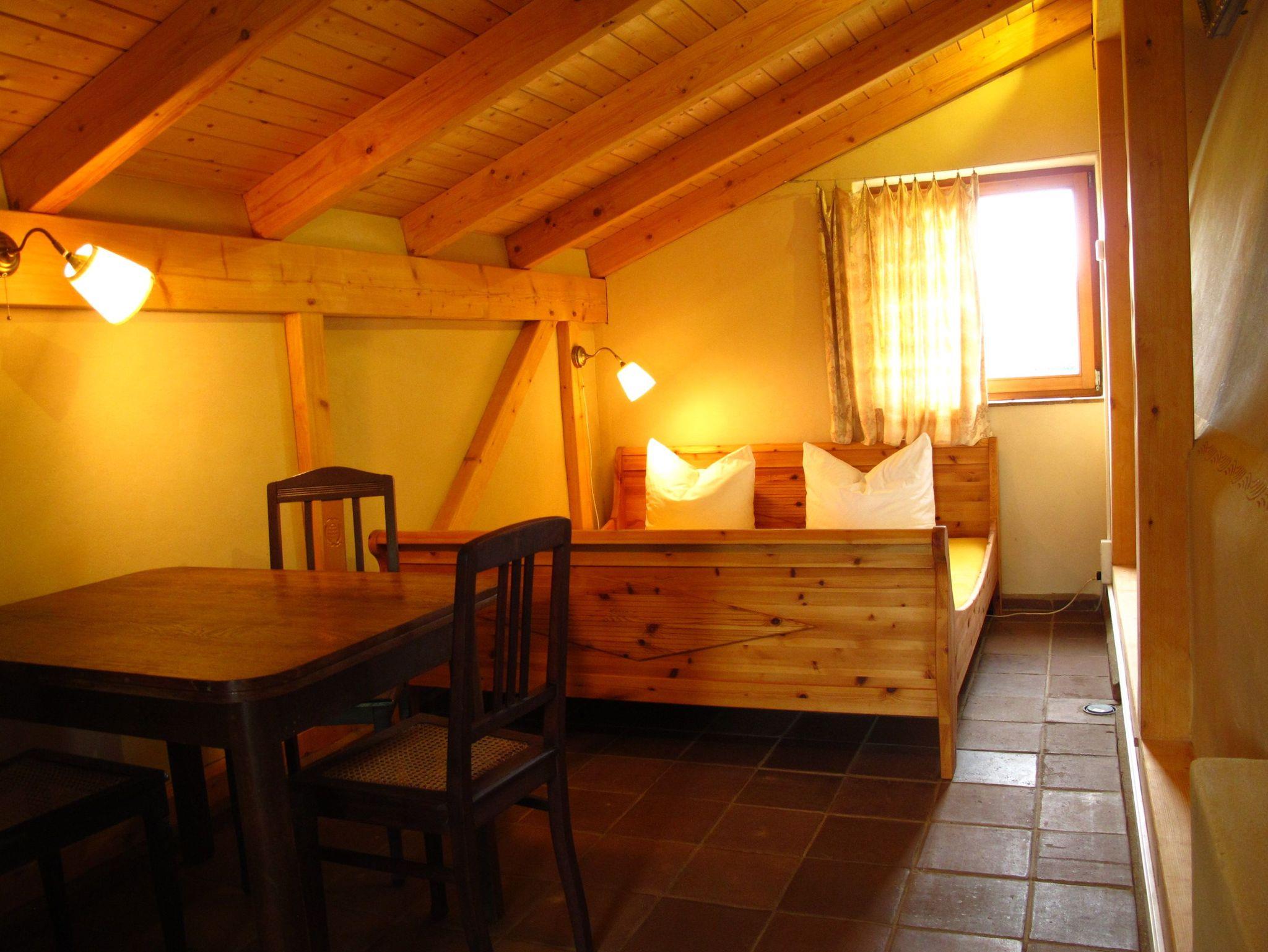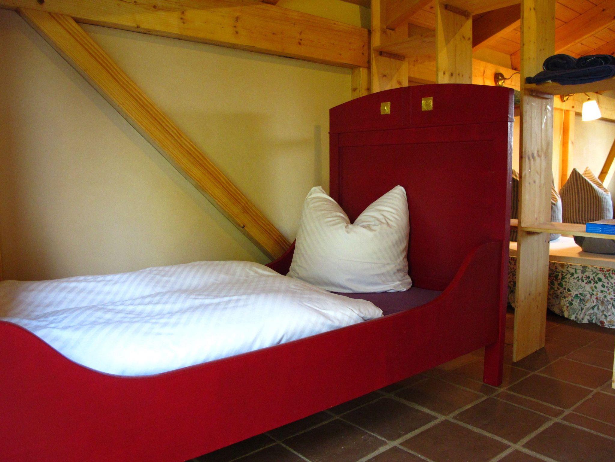 Im Schlafraum sind ein Doppelbett (180 x 200 cm, Höhe 48 cm) und ein Einzelbett (90 x 180 cm) vorhanden. Bettwäsche ist im Übernachtungspreis enthalten.