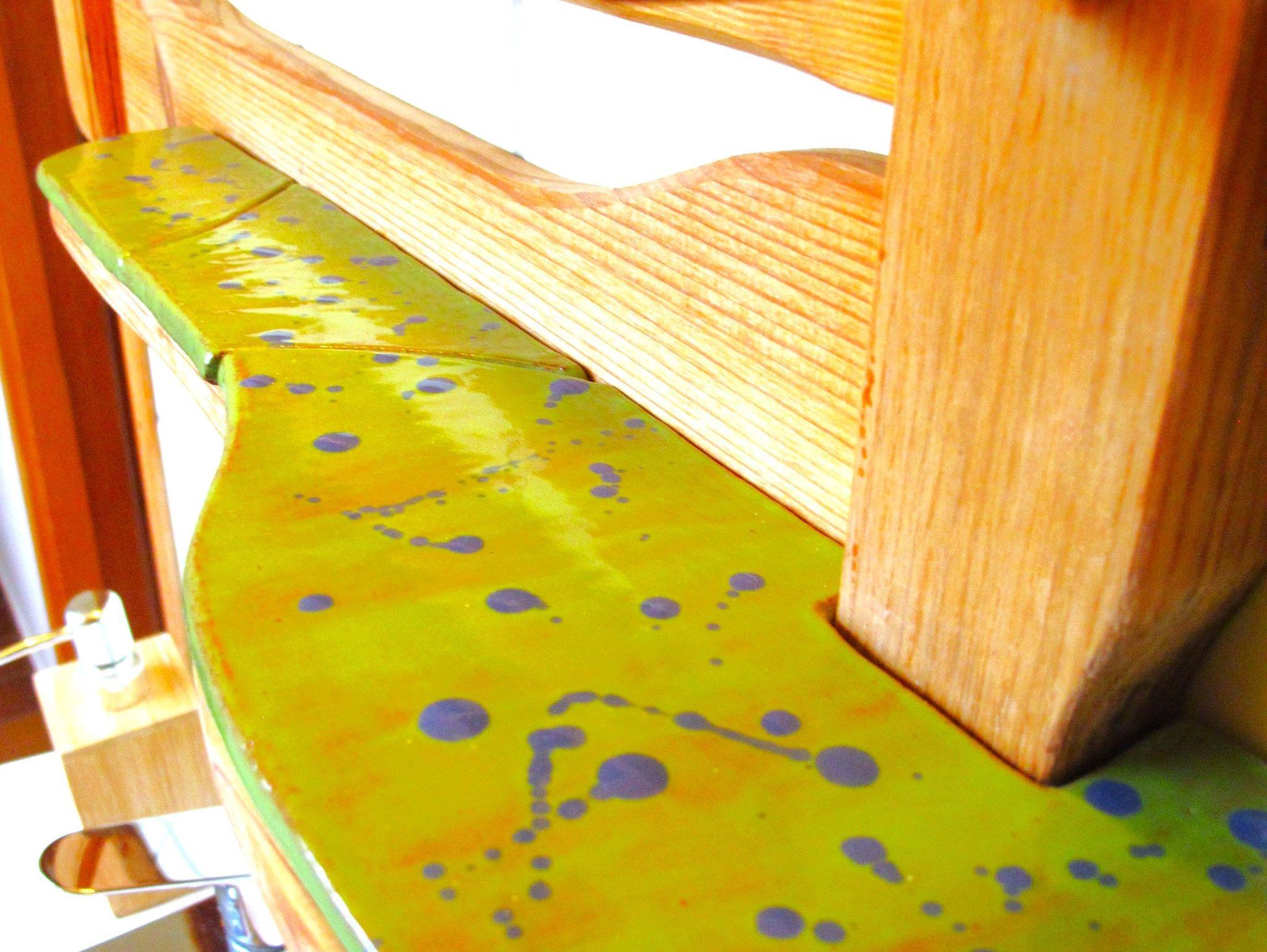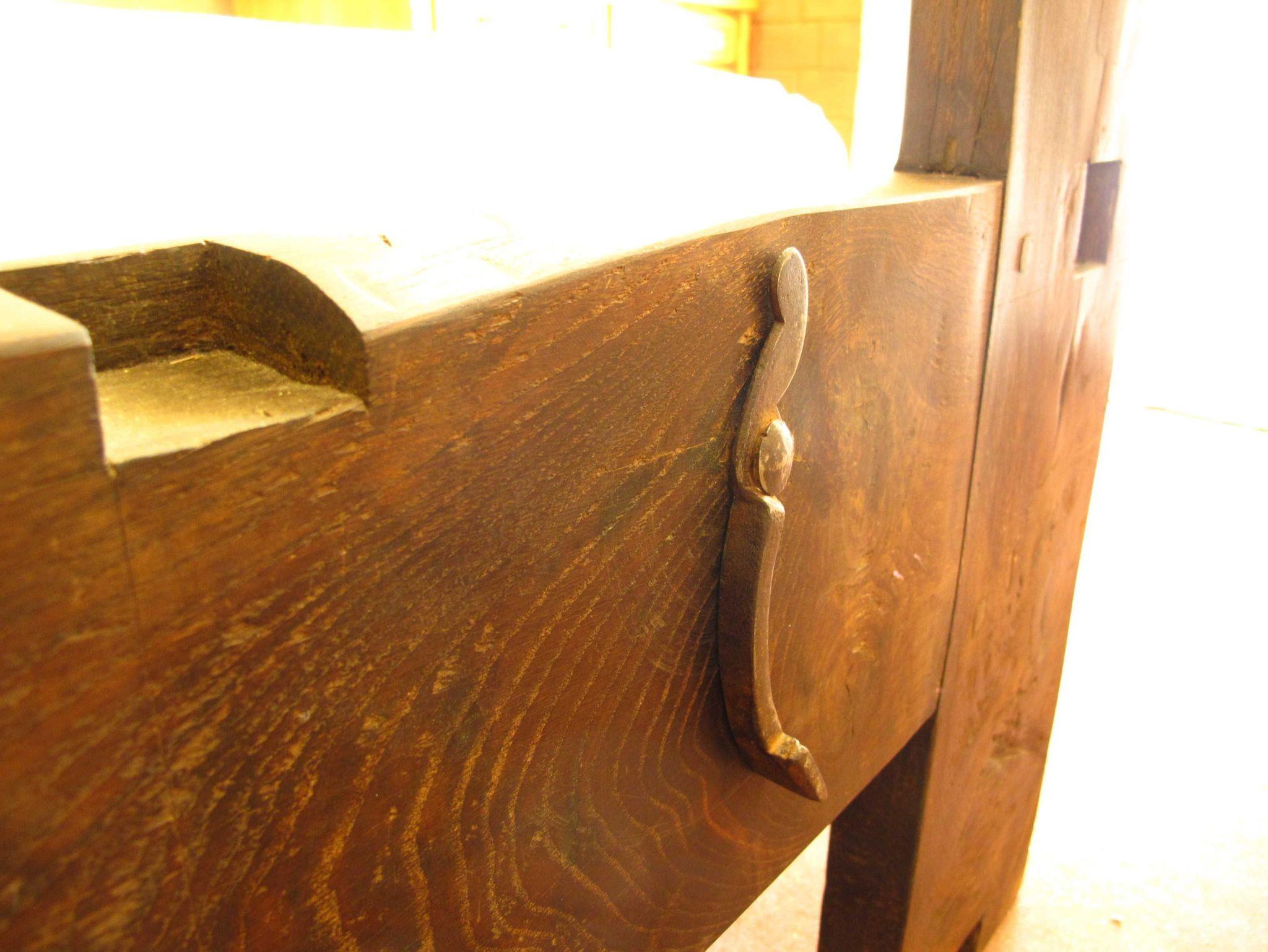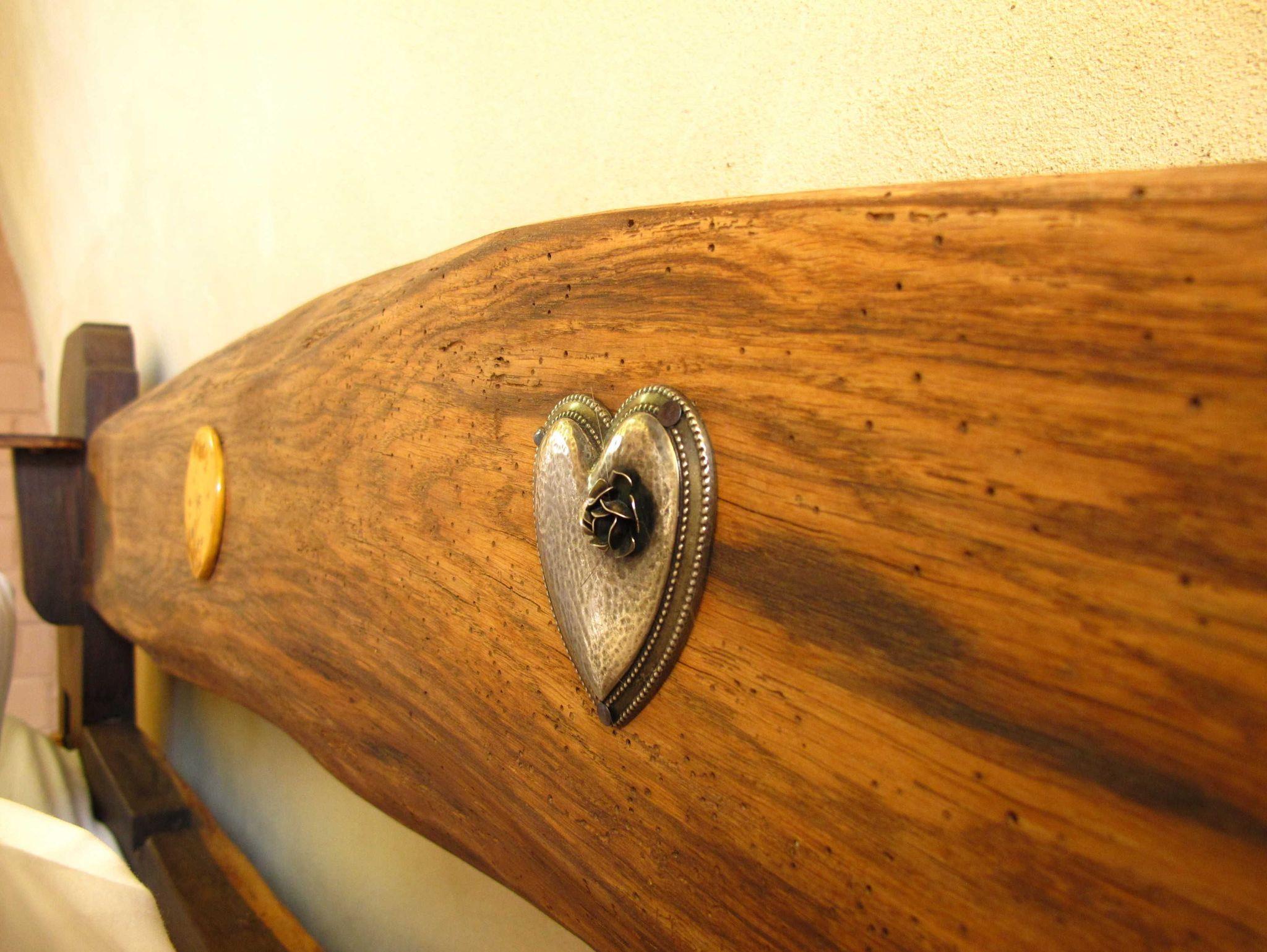 Das Doppelbett (160 x 200 cm) wurde von einem Holzgestalter aus Teilen uralter Webstühle, in Kombination mit Metall und Stein, von Hand gefertigt.