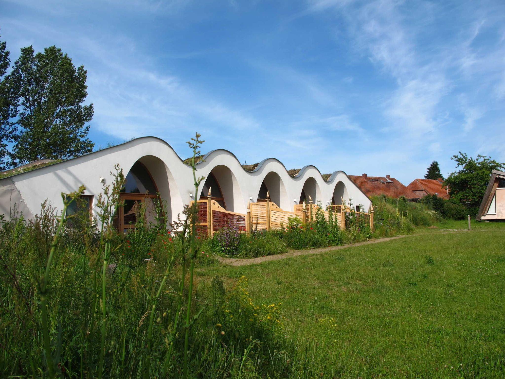 Die Tonnen, wie die einzigartigen, geschwungenen Ferienunterkünfte auf dem Wangeliner Gartengelände intern genannt werden, wurden von einem engagierten Team um Professor Gernot Minke erbaut. Im Jahr 2015 fertiggestellt, sind diese Gästeunterkünfte ein außergewöhnliches Meisterwerk. Sie sind der erste selbsttragende Tonnengewölbebau aus Strohballen, der in Deutschland genehmigt wurde.