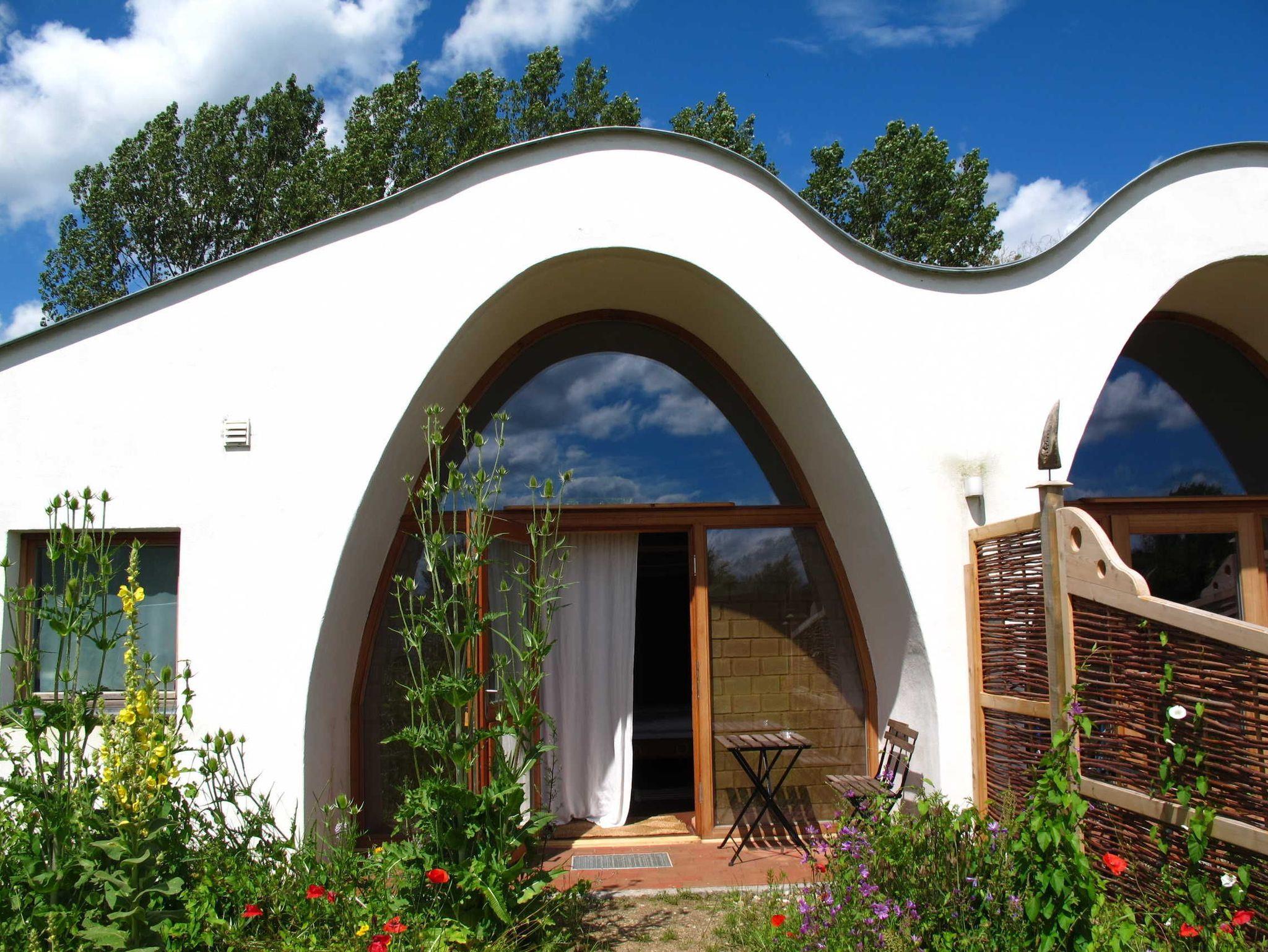 Das 17qm große Doppelzimmer ist eines von fünf Ferienzimmern in unserem aus Strohballen und Lehm gebauten Gästehaus. Es gibt dem Besucher ein besonderes Wohngefühl durch die gewölbeähnliche Raumgestaltung. Es hat einen separaten Zugang von außen und ist mit einem eigenen Bad (Dusche und WC) ausgestattet.