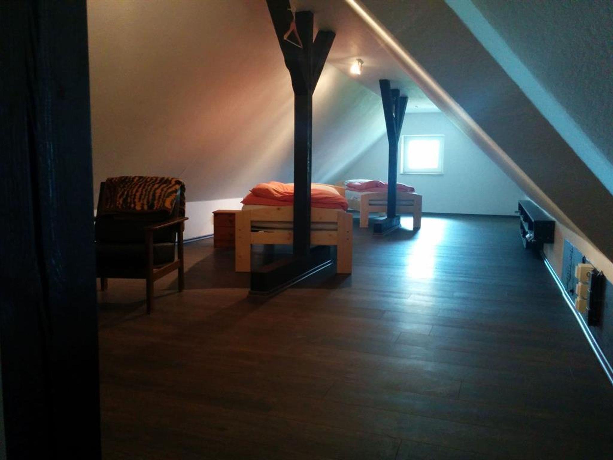 Die Moderne Ausstattung der Ferienwohnung lässt keine Wünsche offen. Auf 120 qm verteilt, stehen zwei (Doppel-)Schlafzimmer, Küche, Tageslichtbad, Gäste-WC, Abstellraum (mit Waschmaschine und Trockner) und ein ca. 50 qm großes Wohn-Esszimmer (mit Schlafcouch). Das Dachgeschoss ist wohnlich ausgebaut. Dort stehen vier Einzelbetten, eins davon in einer Nische. Genießen Sie den Komfort eines PKW-Parkplatzes direkt vor der Tür, während Ihre Fahrräder sicher im Einstellplatz für Fahrräder untergebracht werden können. Für Familien bieten wir ein Kinderbett und einen Kinderhochstuhl, damit auch die Kleinsten sich rundum wohlfühlen. Außerdem steht Ihnen eine Waschmaschine und Wäschetrockner zur Verfügung, ideal für längere Aufenthalte.