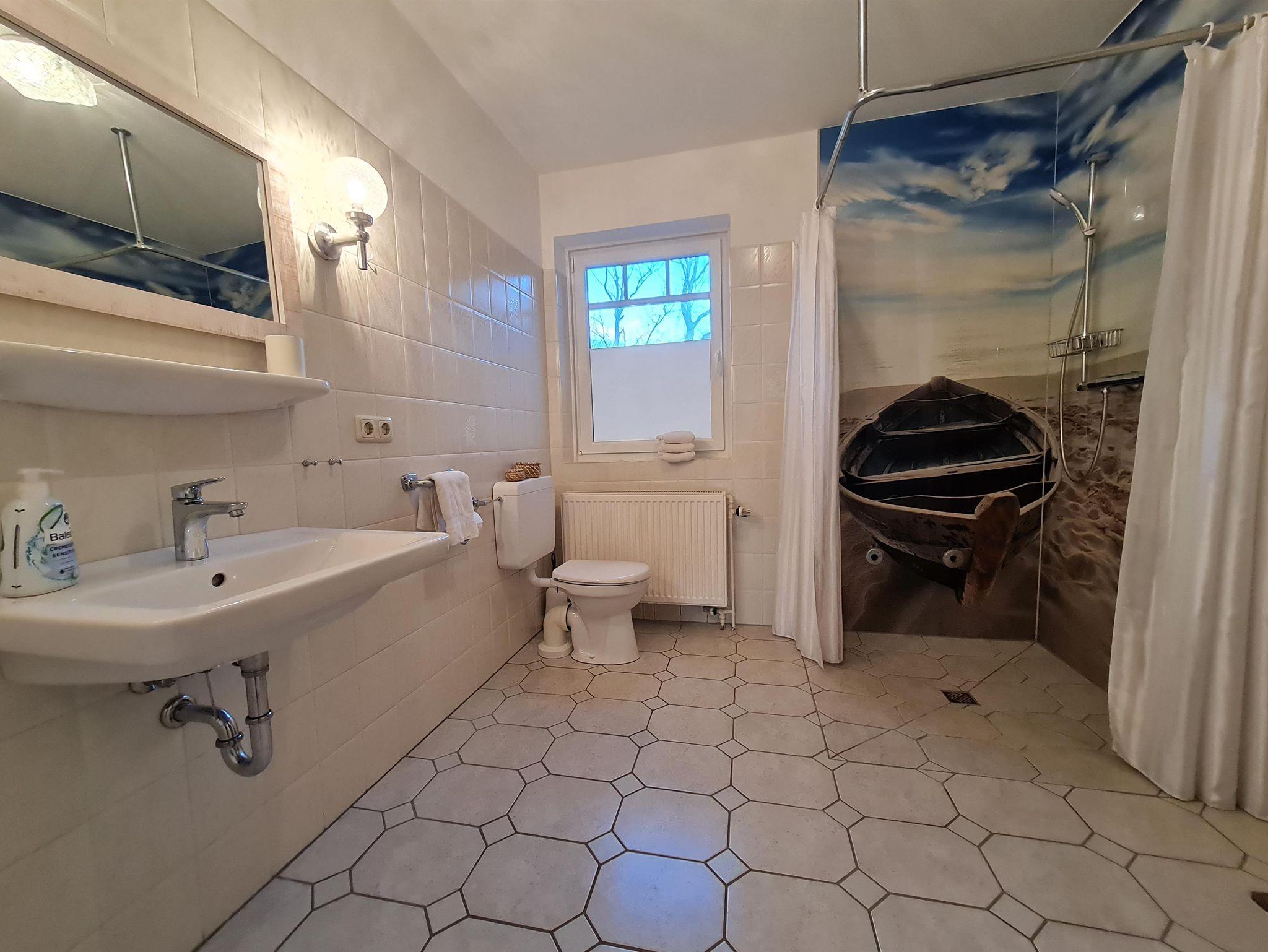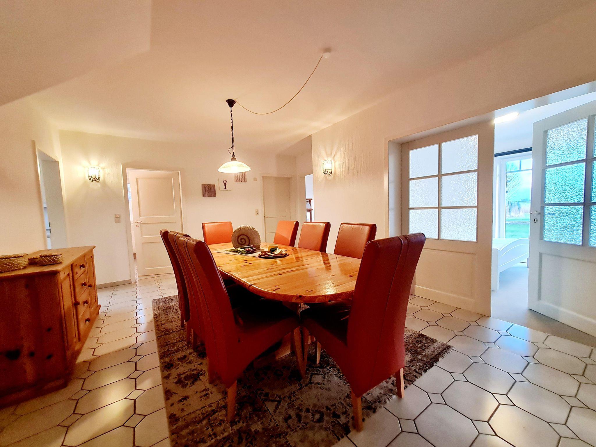 Unsere Ferienwohnung „Marschenblick“ im Ferienhaus zeigt den tollen weiten Blick in unsere Marschlandschaft und ist mit 140 qm unsere größte FeWo. Sie ist ebenerdig und für Rollstuhlfahrer geeignet. Der zentrale Raum in der Wohnung dient als Diele. Hier finden sie einen großen gemütlichen Esstisch mit viel Platz zum „Klönen“(„plaudern“), Essen und Spielen. Von diesem Raum zweigen sich alle Weiteren sternförmig ab: Die große Küche (Herd mit Backofen, Dunstabzugshaube, Kühlschrank mit Gefrierfach, Spülmaschine, Küchenmaschine, Mikrowelle, Wasserkocher, Kaffeemaschine, Toaster) Badezimmer mit befahrbarer Dusche Kinderzimmer mit Etagenbett und einem Einzelbett Elternschlafzimmer mit Doppelbett und Terassentür Großes Wohnzimmer mit Flachbildschirm mit Sat. und Wohnwand Drittes Schlafzimmer mit Doppelbett und Zustellbett Kleines Bad mit Waschbecken und WC WLAN ist im Bauernhaus sowie im Garten und auf dem Hofplatz jederzeit verfügbar und zusätzlich buchbar; die Ferienwohnungen im Ferienhaus sind nicht für den WLAN-Empfang ausgelegt. Wir bitten um Verständnis.