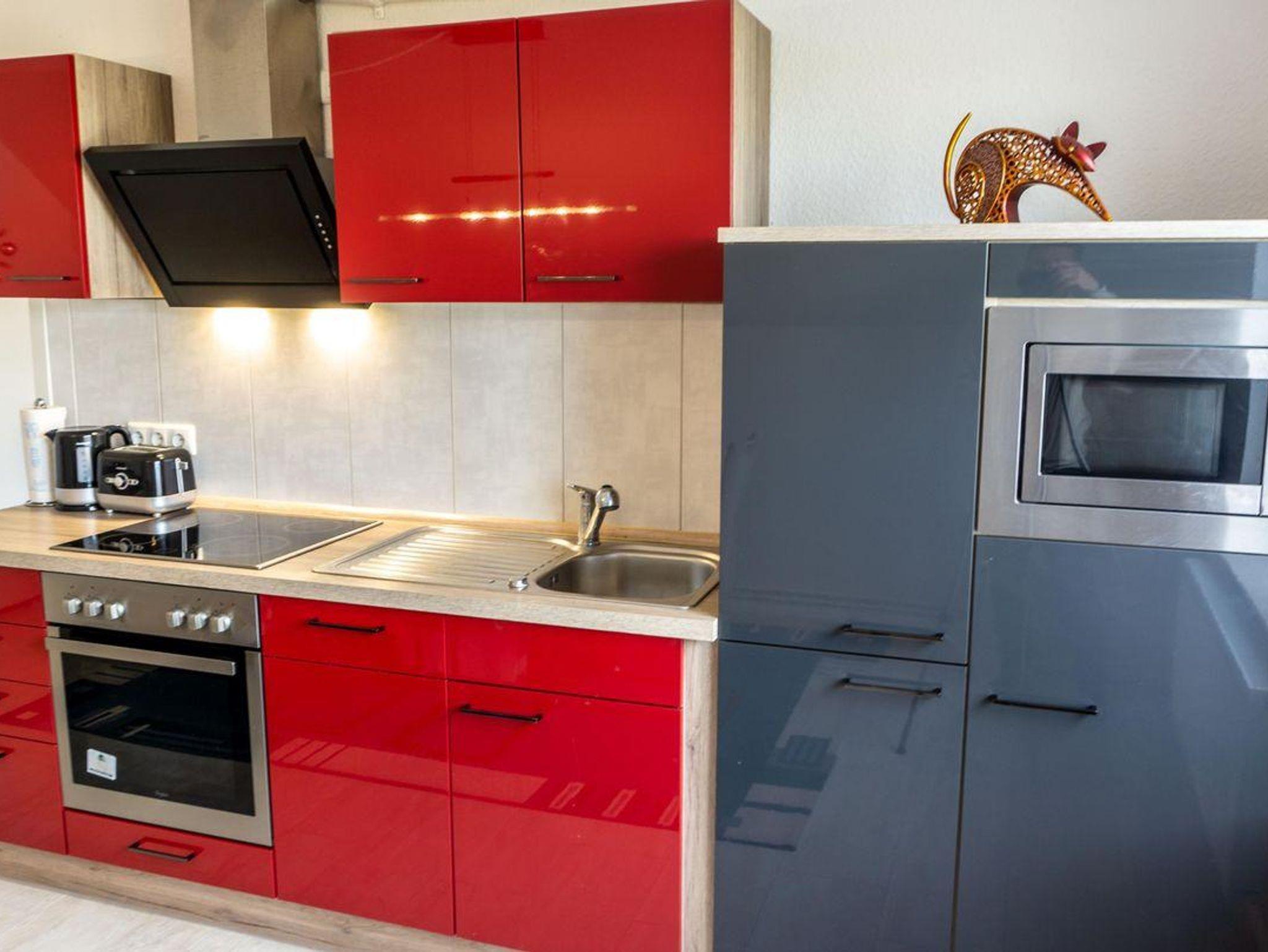 Die Küche ist geschlossen und mit einem Esstisch sowie einer umfassenden Ausstattung versehen. Hier stehen Ihnen Ceranherd, Backofen, Kühlschrank mit Gefrierfach, Mikrowelle, Spülmaschine, Kaffeemaschine und viele weitere Küchengeräte wie Mixer, Wasserkocher, Eierkocher und Toaster zur Verfügung. Sämtliche Küchenutensilien, Geschirr, Besteck sowie Geschirrhandtücher sind in der Erstausstattung enthalten.