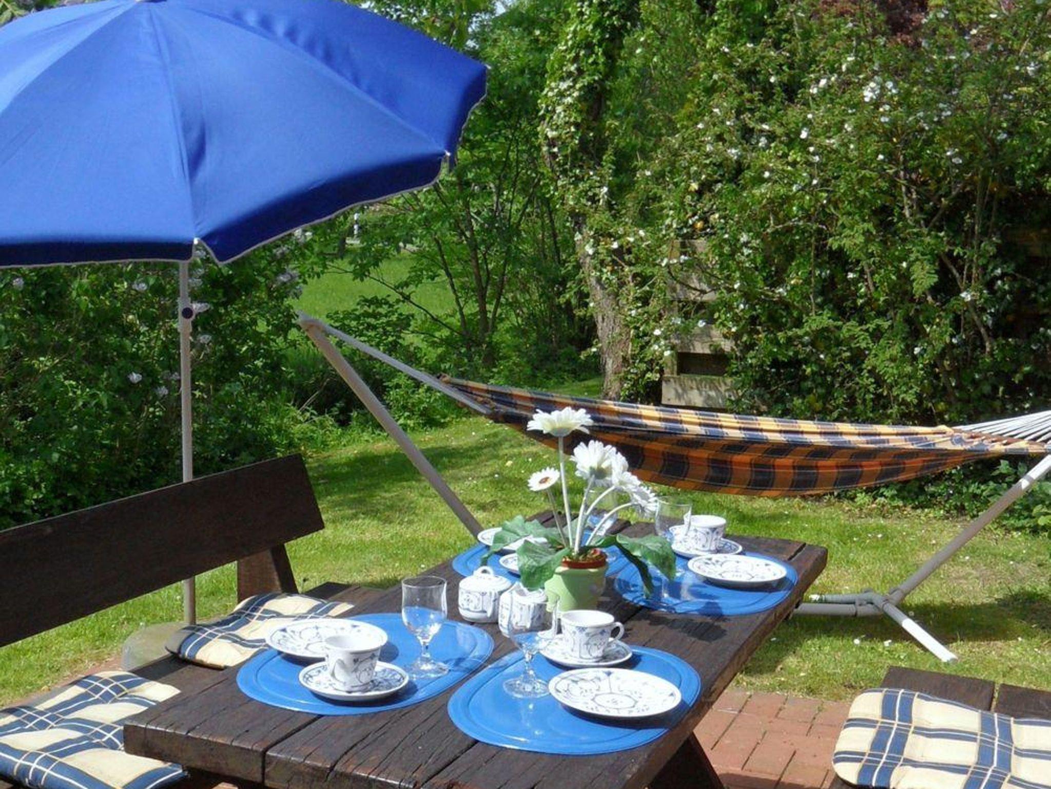 Besonderes Augenmerk gilt dem Außenbereich, der sich ideal für entspannte Tage im Freien anbietet. Ihnen stehen eine Terrasse mit Gartenmöbeln und Sonnenliegen, ein Sonnenschirm und sogar eine Hängematte zur Verfügung. Der liebevoll angelegte Garten beherbergt außerdem einen Sandkasten und eine Schaukel, wodurch auch kleine Gäste auf ihre Kosten kommen. Für gesellige Abende können Sie den Kohlegrill nutzen. Ein Privatparkplatz am Haus sorgt für eine bequeme An- und Abreise.
